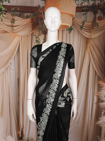 Black Solid Design Chiffon Saree with Contrasting Leaf Motif Border
