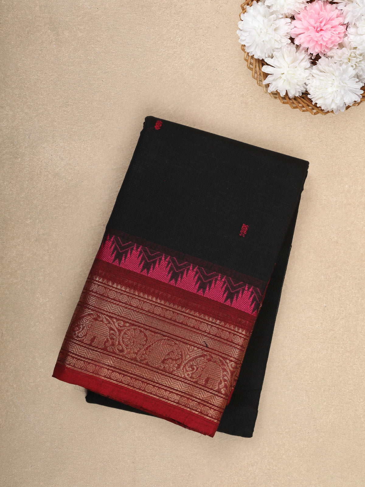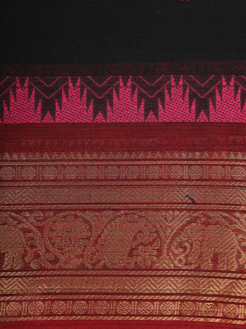 Black Solid Design Cotton Saree with Red Temple Border