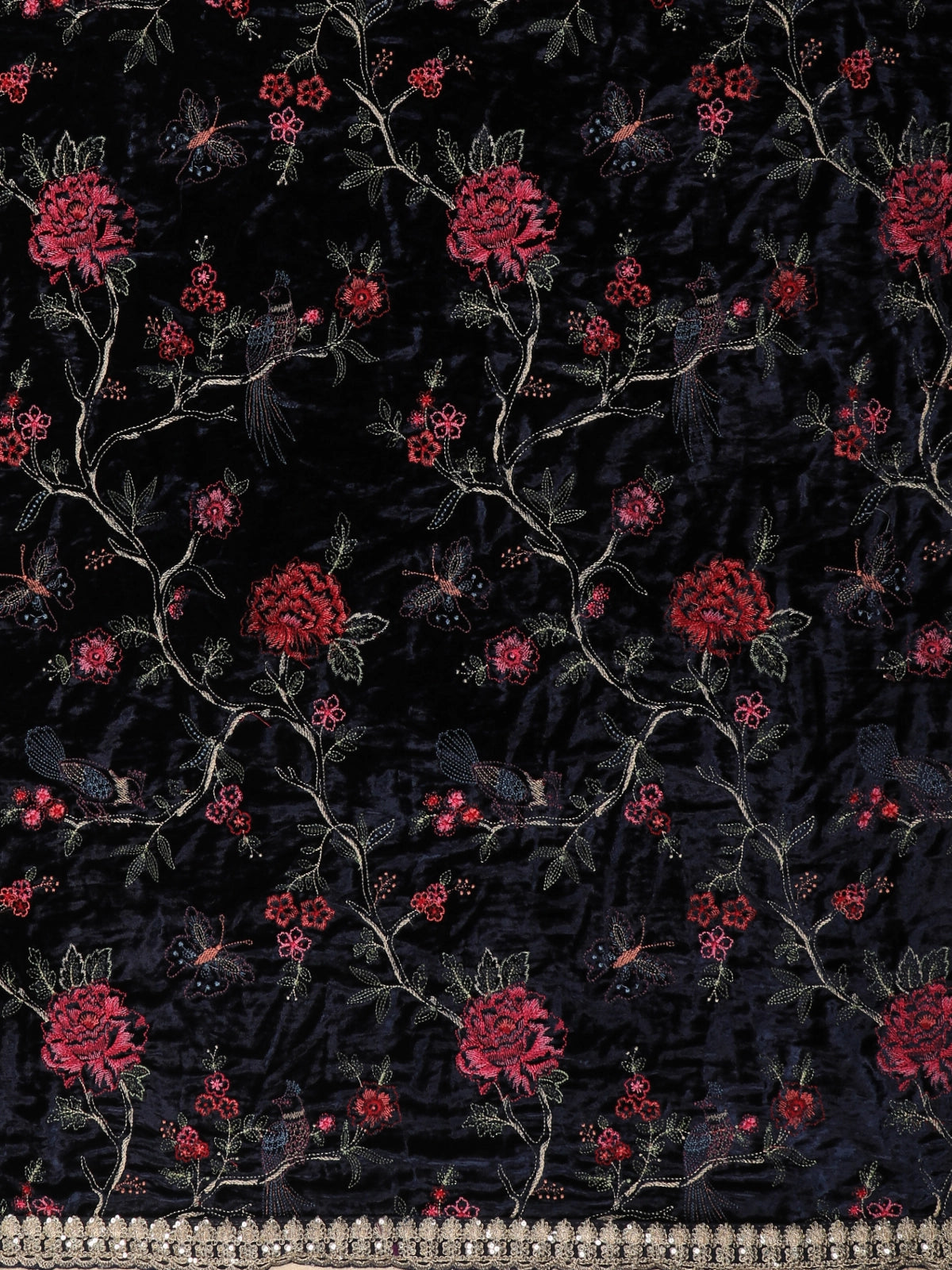 The body is embellished with a refined all-over sequins design, adding a subtle sparkle against the deep black backdrop, creating an effortlessly chic and sophisticated appeal. The saree is edged with an intricately stonework-embellished designer border, bringing a perfect blend of classic beauty and modern glamour.