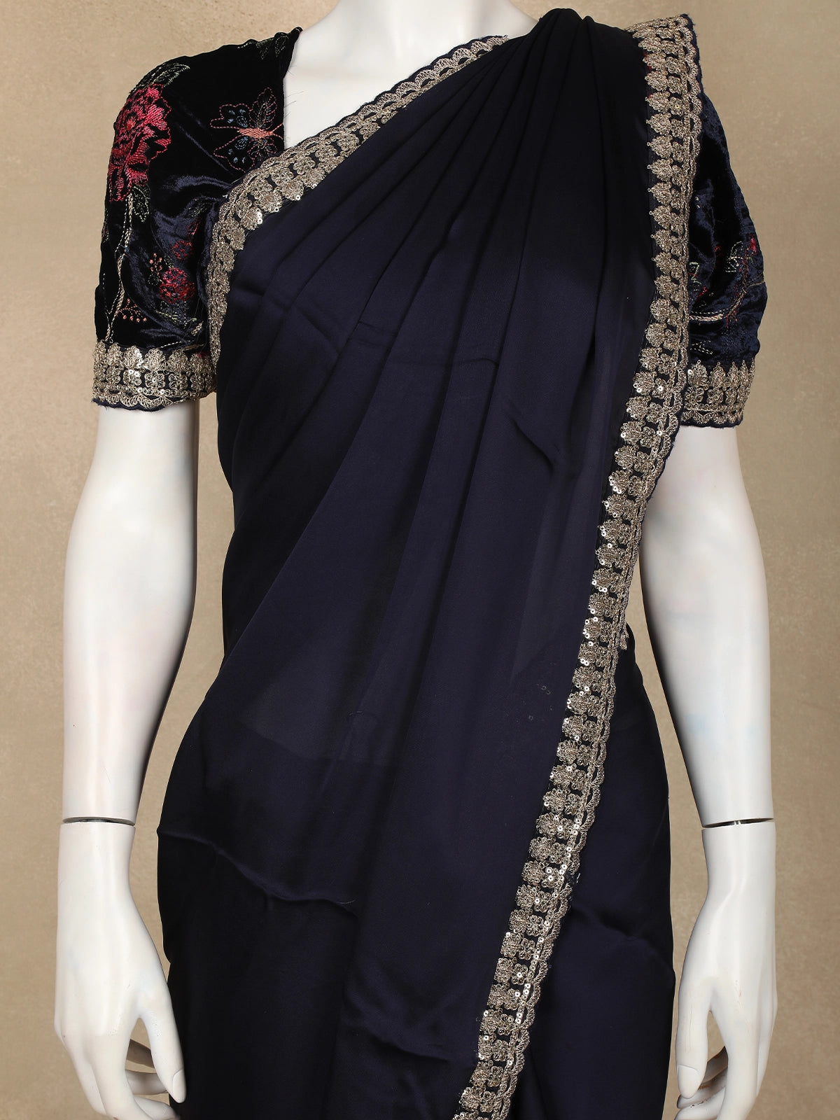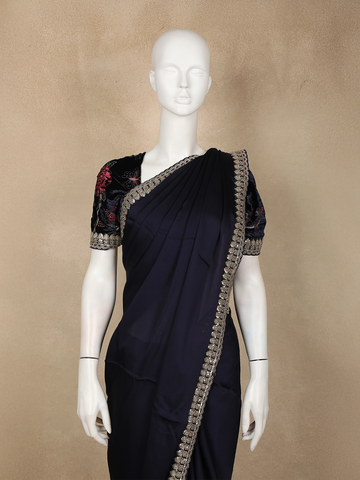 Completed with a matching black pallu and blouse, this ensemble is ideal for cocktail parties, festive events, and elegant evening occasions.