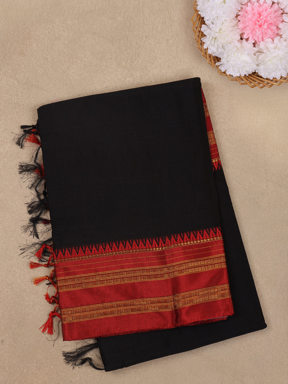 Black Solid Design Semi Silk Cotton Saree with Contrast Red Border