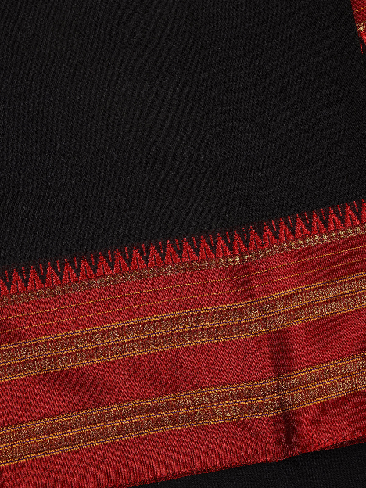 The rich red border showcases intricate zari weaving with temple-inspired motifs, adding cultural authenticity and enhancing the traditional look. The saree comes with a coordinated black pallu finished with hand-twisted tassels, lending a charming handcrafted touch. Completing the look is the contrast red blouse piece, giving a neat and classic finish.