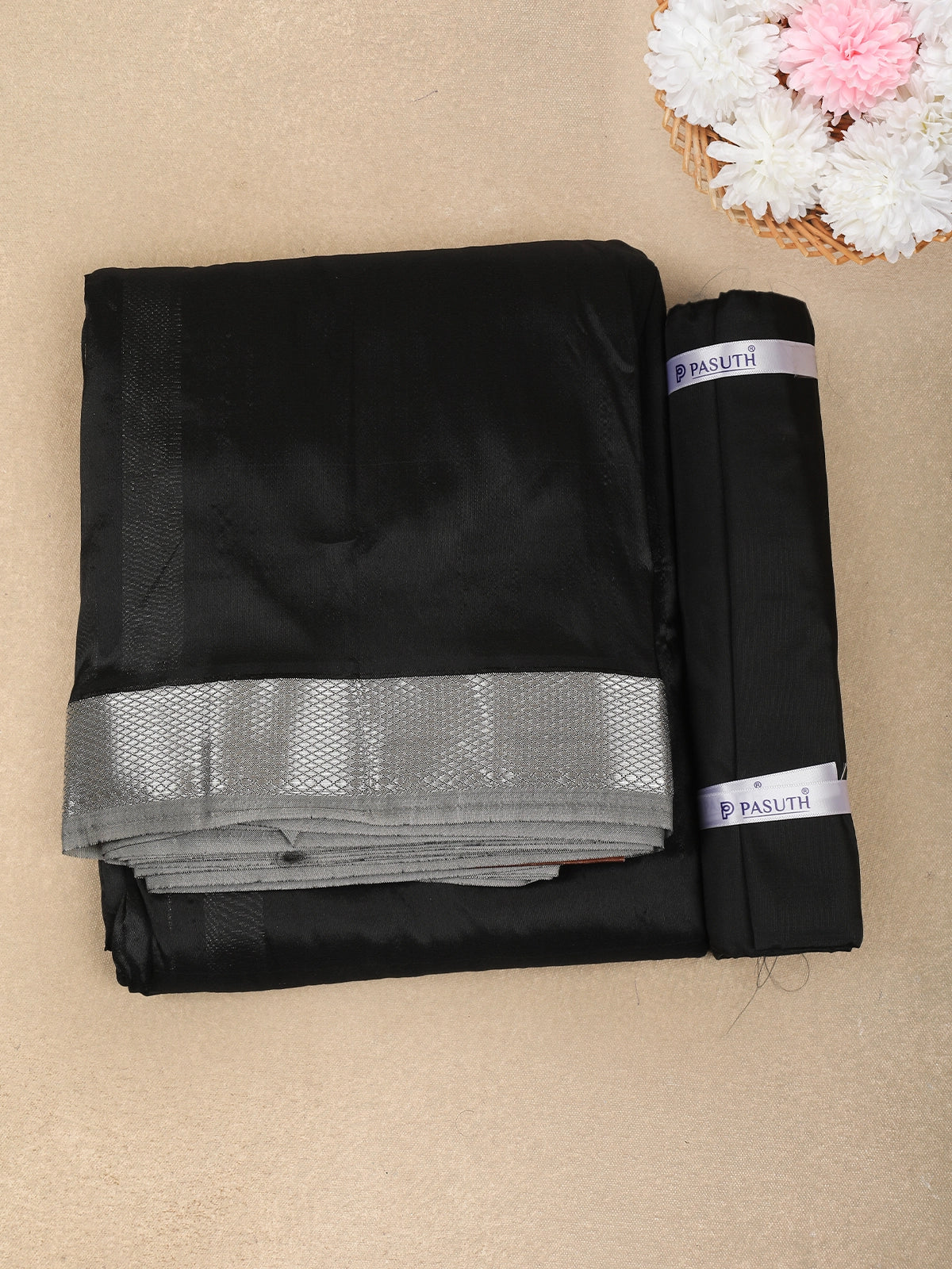 Black Solid Design Unstitched Shirt with Matching Dhoti Set with Zari Border