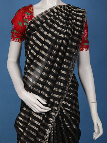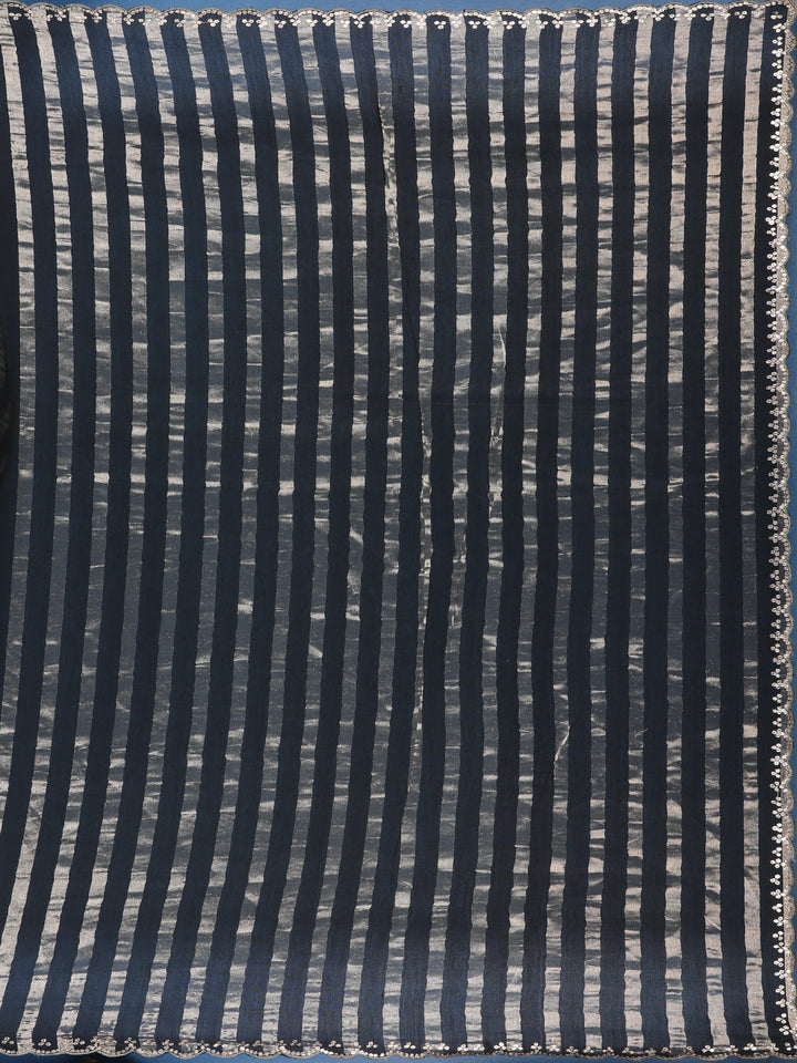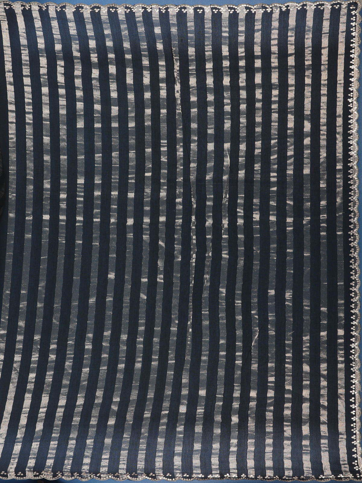 Step into glamour with this stunning black tissue saree, a masterpiece designed for modern elegance and festive grandeur. Crafted from premium tissue fabric, the saree drapes gracefully with a natural sheen that enhances its luxurious appeal. The striped woven design adds a contemporary charm, while the designer border in metallic highlights elevates the look with sophistication.
