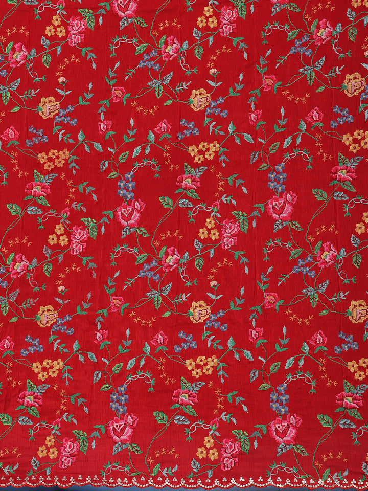 Paired with a striking contrast red blouse, this saree balances traditional richness with a bold touch. The matching beige pallu brings subtle elegance, creating a harmonious blend of colors perfect for special occasions.