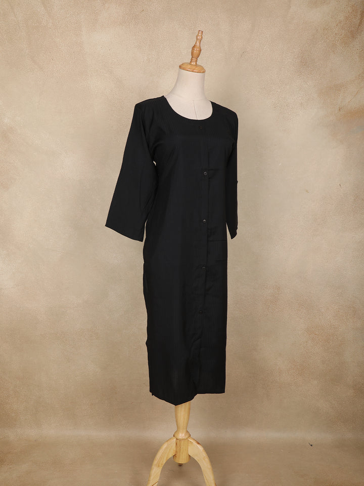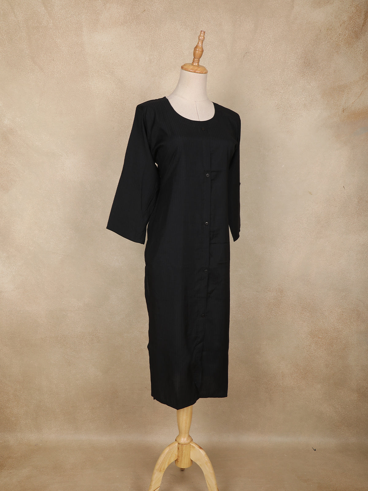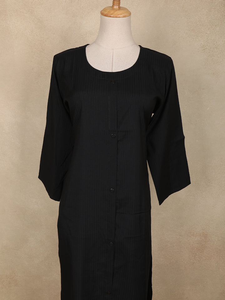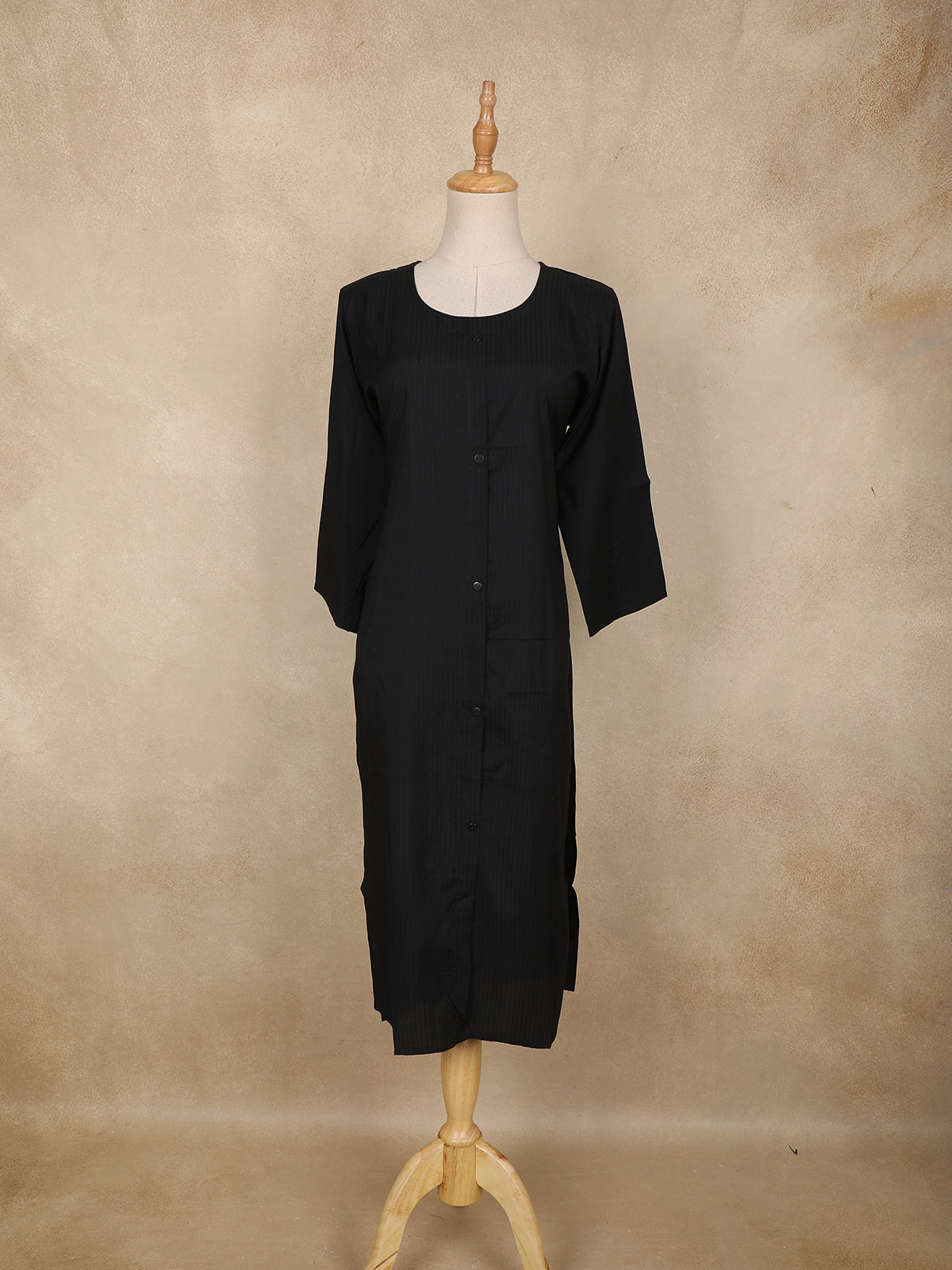 Step into effortless elegance with this Black Striped Cotton Kurti, designed for women who love comfort blended with minimal chic. Crafted from soft and breathable cotton fabric, this kurti features a subtle vertical stripe texture that adds a refined and elongated look to the silhouette.