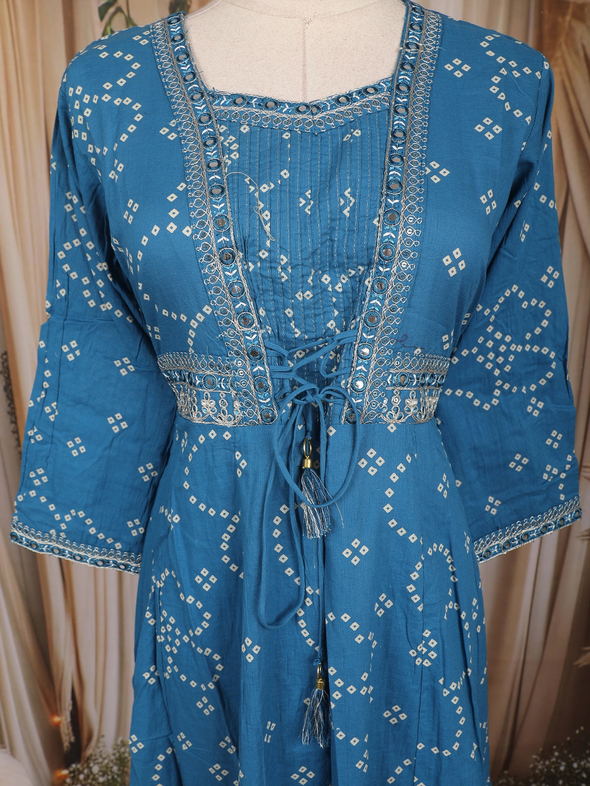 Radiate festive elegance in this blue cotton Anarkali suit, featuring intricate Bandhani-inspired prints highlighted with exquisite mirror and thread embroidery along the neckline, yoke, and sleeves. The design showcases a flattering fit-and-flare silhouette with a drawstring tie-up at the waist, adding both style and comfort. A matching Bandhani printed dupatta completes this ethnic ensemble, making it perfect for festive gatherings, haldi functions, or casual celebrations with a traditional twist.