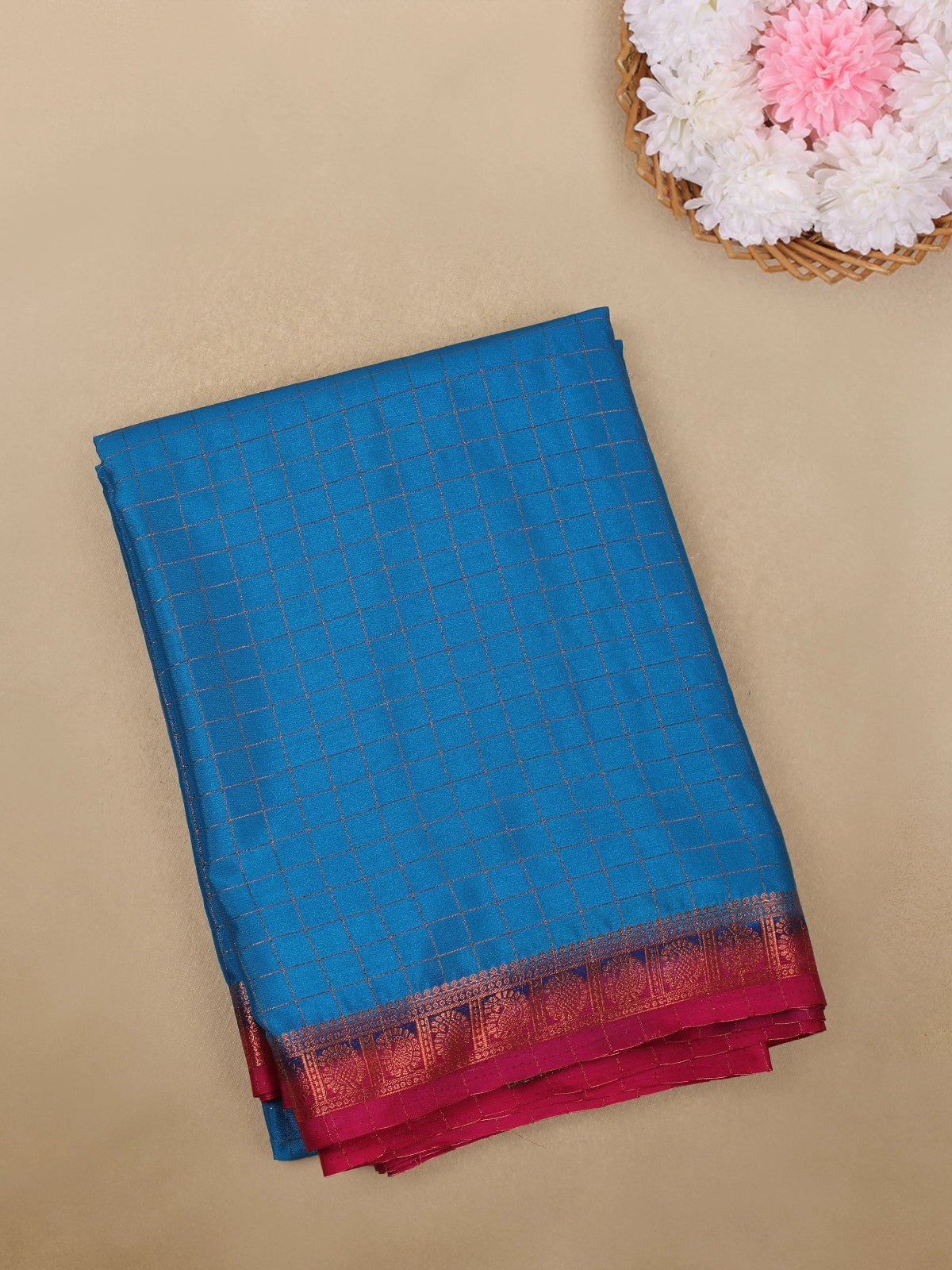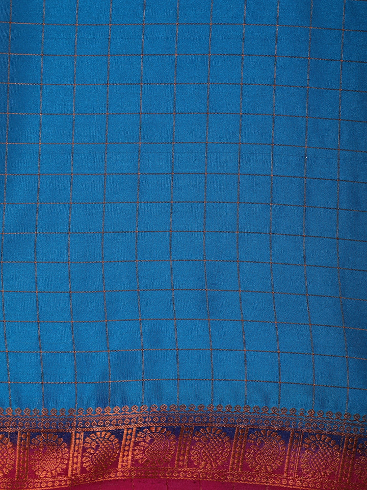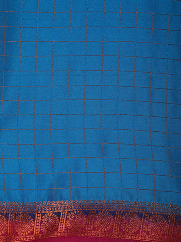 Blue Checks Woven Mysore Silk Saree With Contrast Pink Zari Border