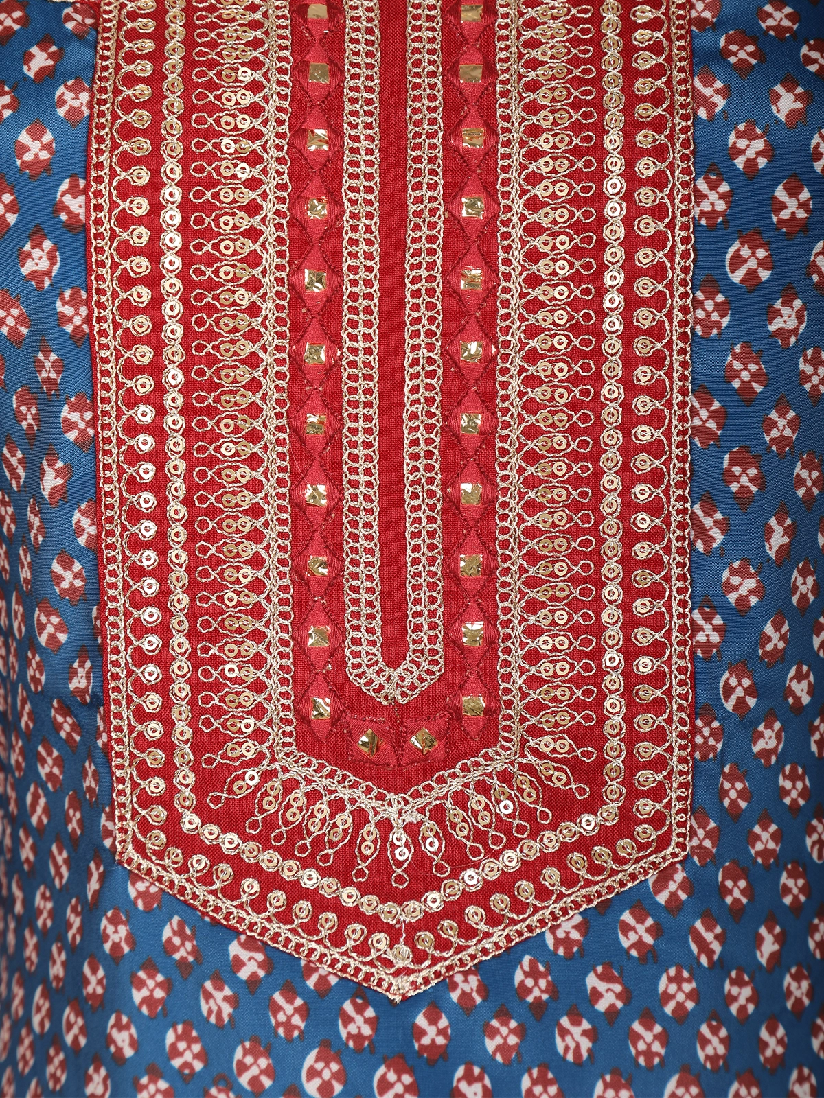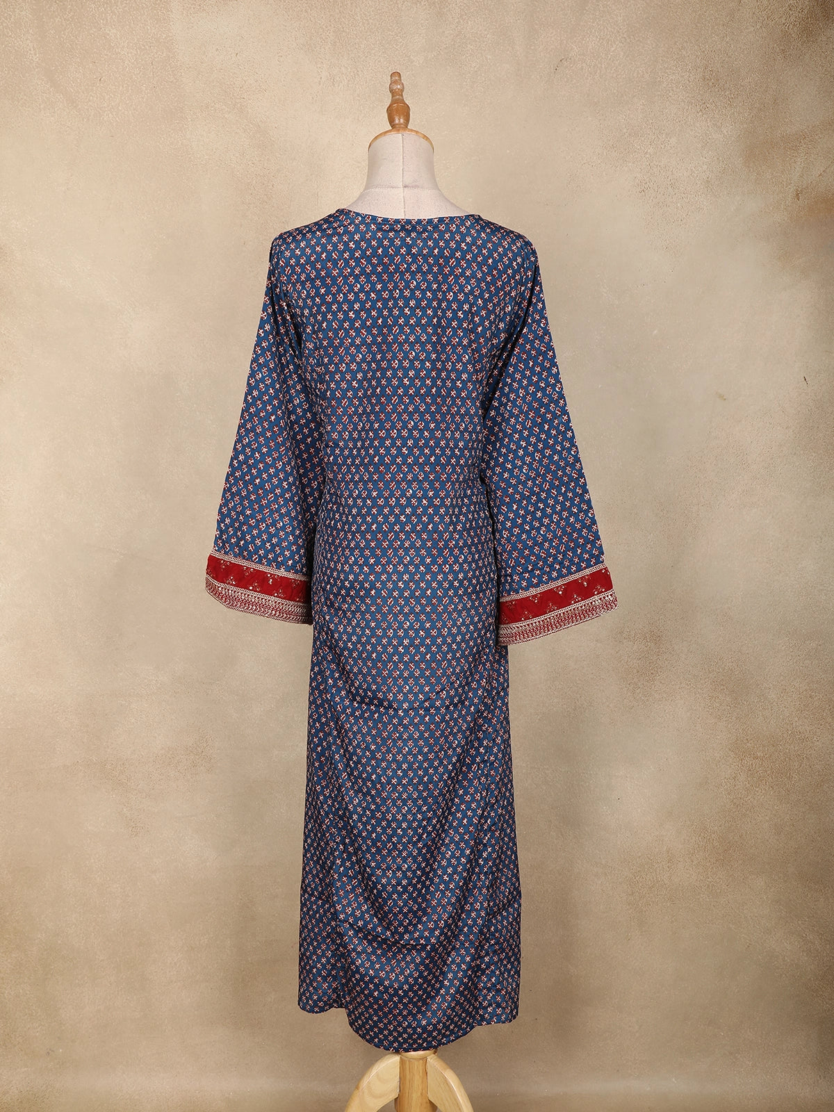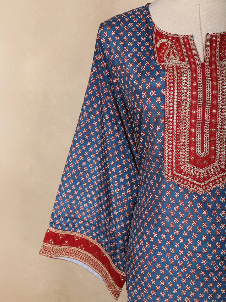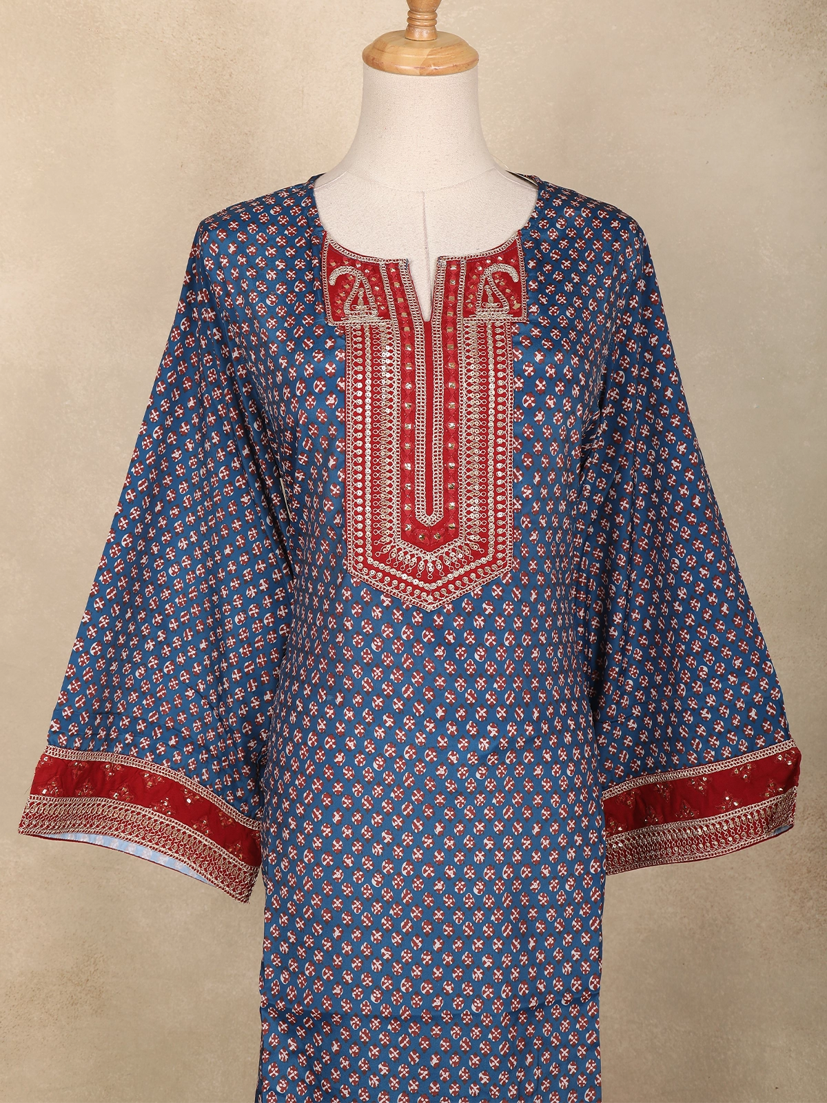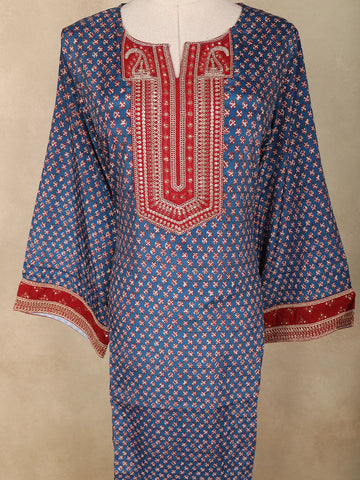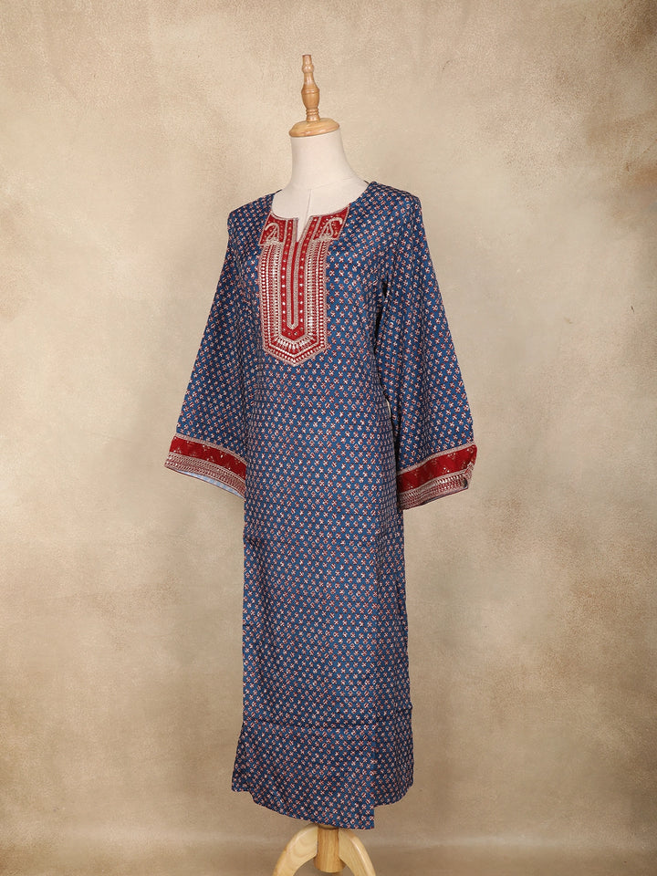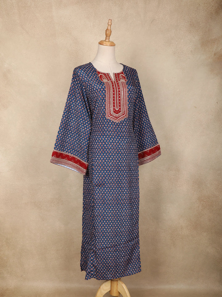 A stylish and comfortable kurti top crafted in soft cotton, featuring an all-over blue dot print paired with a beautifully detailed embroidered yoke in contrast red. The roomy kaftan-style sleeves enhance comfort, while the intricate sleeve borders uplift the overall elegance. Perfect for everyday wear or casual outings with a touch of ethnic charm.
