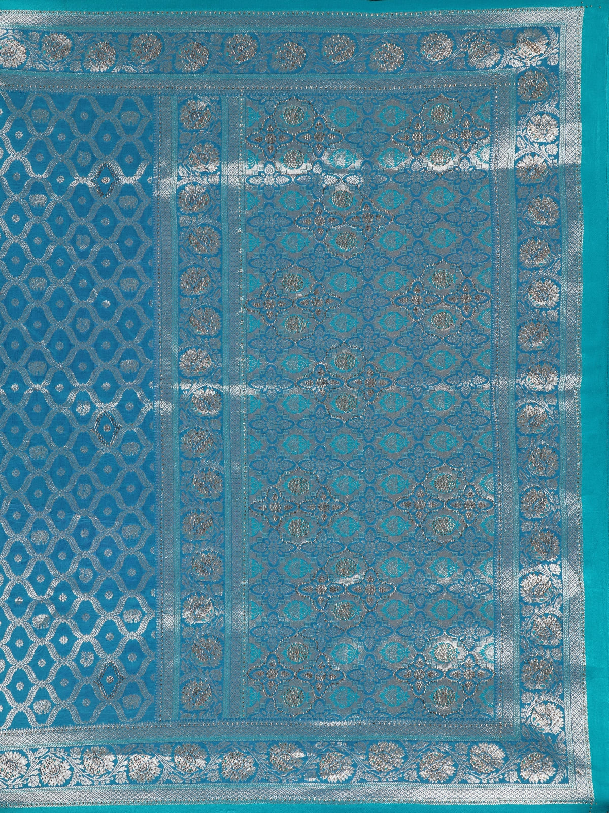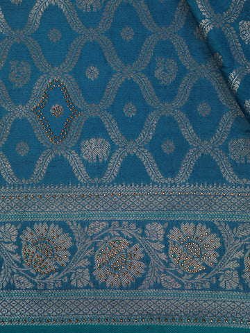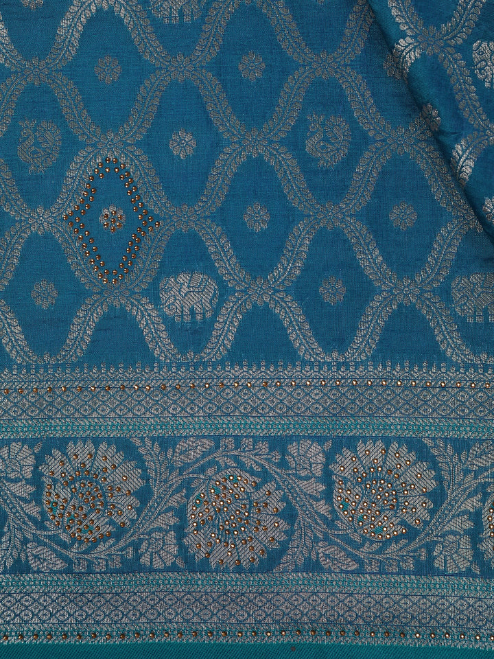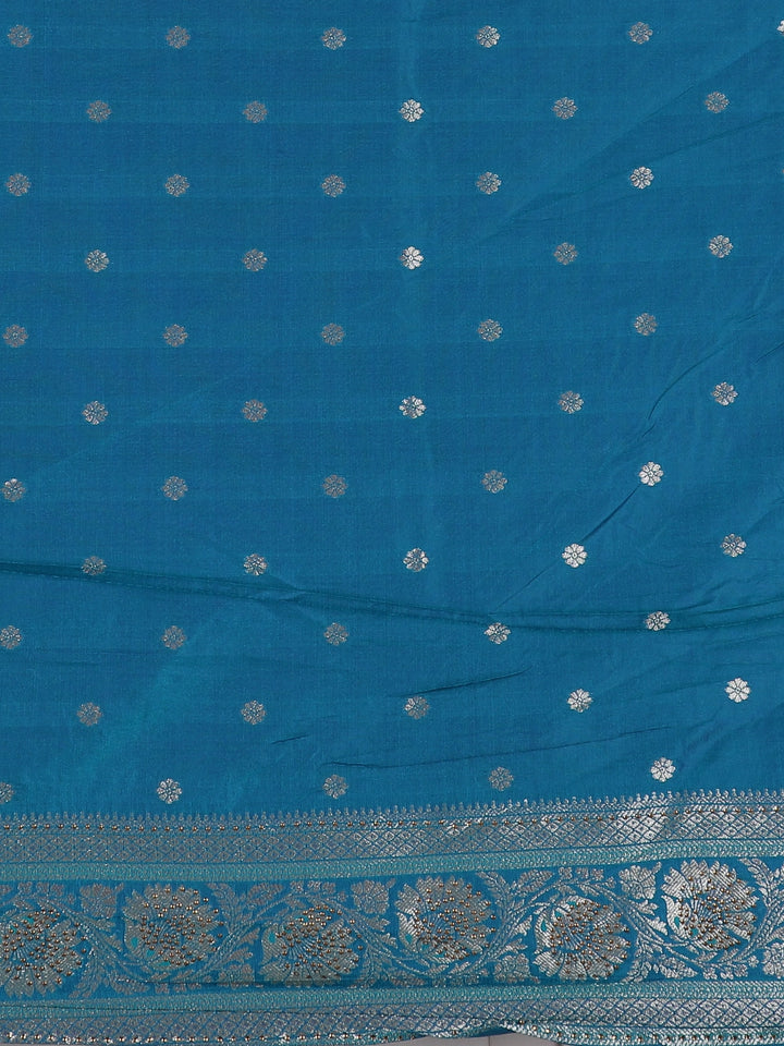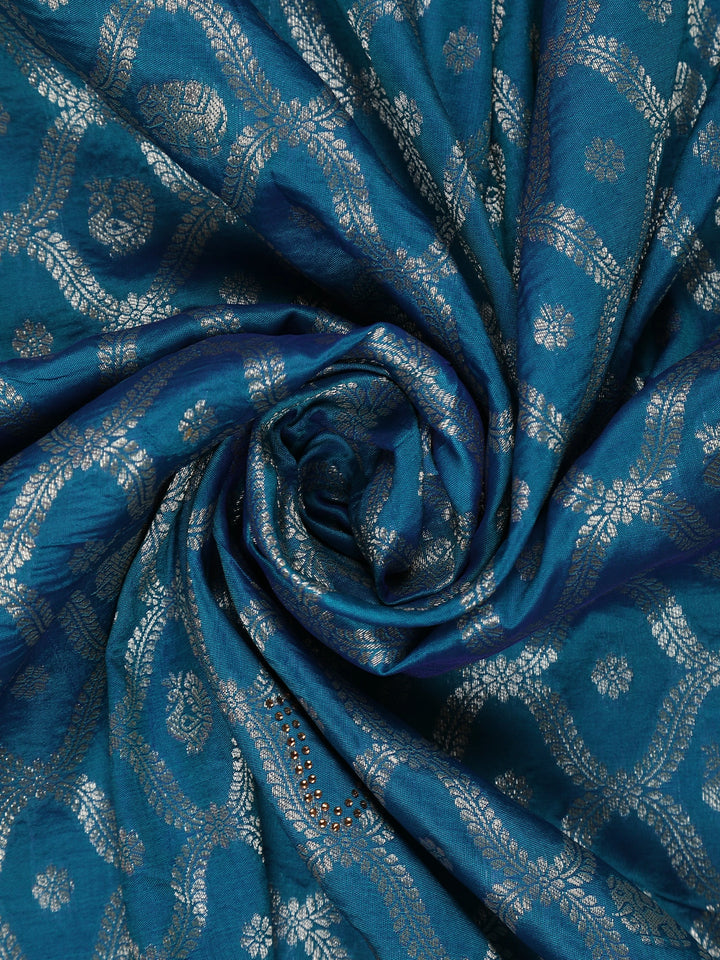 Radiate festive elegance in this Blue Semi Banarasi Silk Saree, a graceful fusion of traditional artistry and modern charm. The saree features a zari-woven floral design, intricately detailed with shimmering silver motifs that enhance its royal appeal.