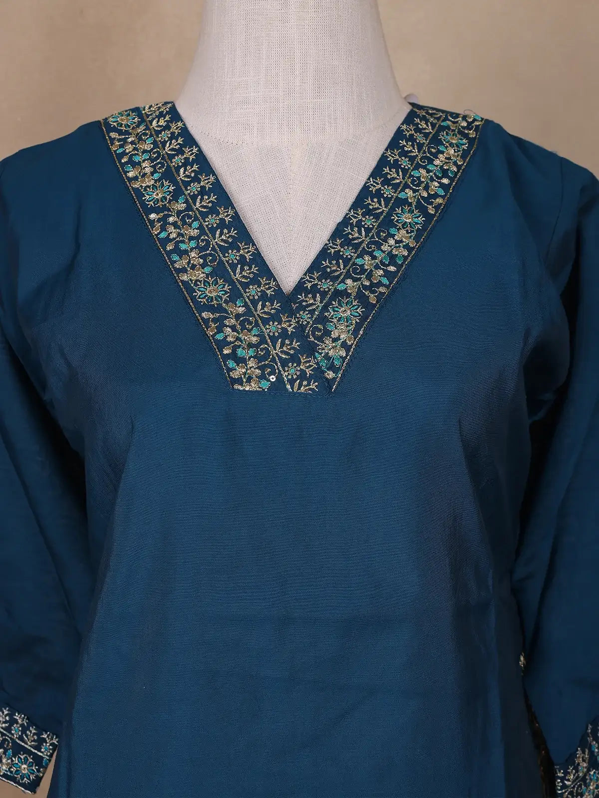The refreshing blue base is adorned with delicate floral motifs, creating a soft yet eye-catching appeal. The V-neckline flatters the collarbone and adds a refined touch, while the 3/4 sleeves lend just the right amount of coverage with a hint of sophistication.
