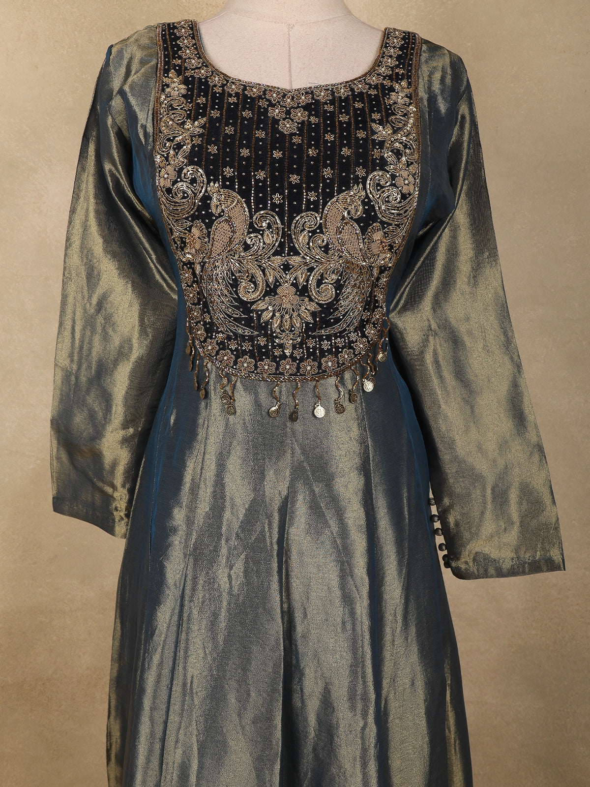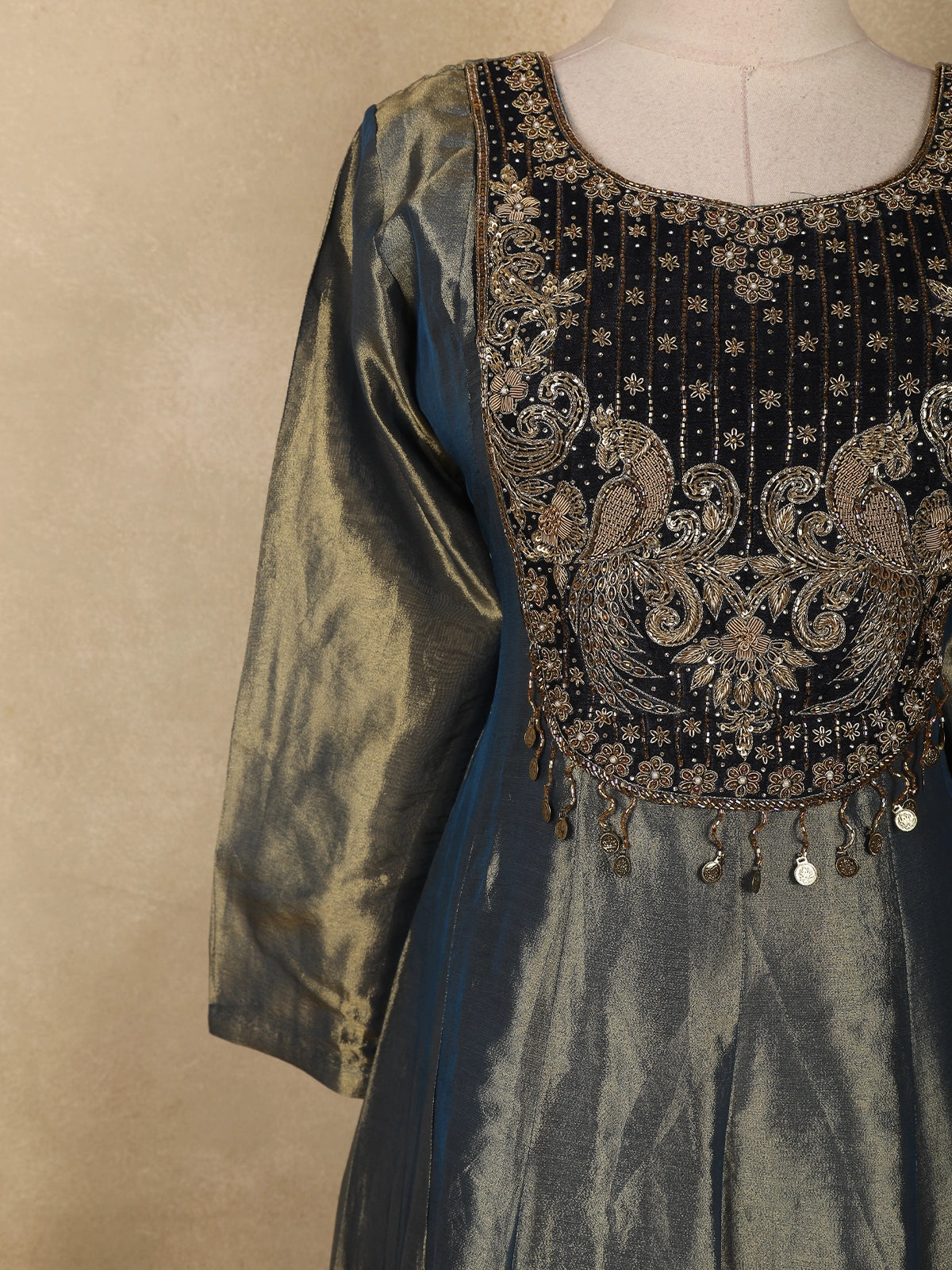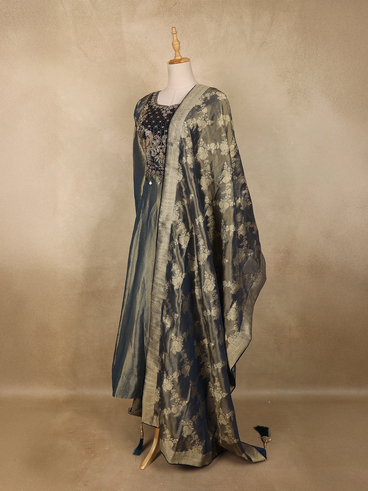 The kurta is beautifully highlighted with intricate floral embroidery, delicately crafted using fine thread and embellishment work that adds depth and texture to the silhouette. The embroidery is thoughtfully placed to accentuate the neckline and bodice, lending a regal and feminine appeal.
