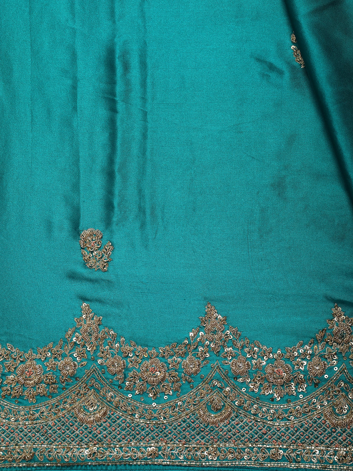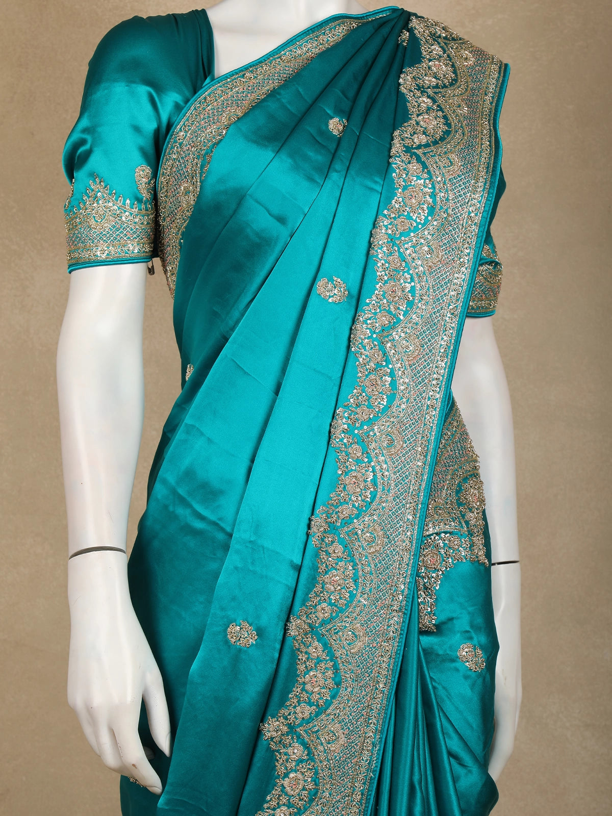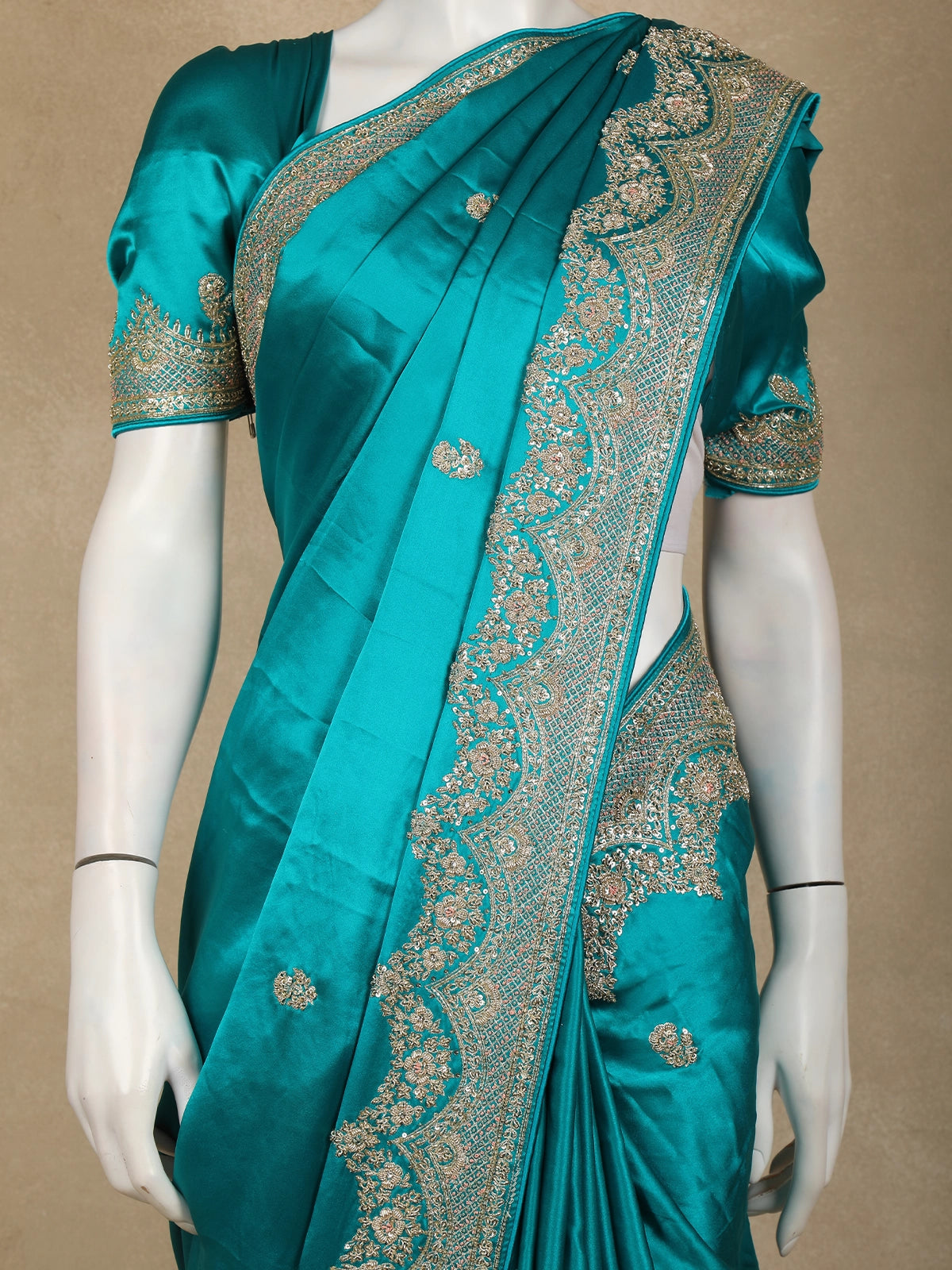 Intricately adorned with heavy floral embroidery, the saree features exquisite sequins and bead embellishments that shimmer beautifully with every movement. The ornate embroidered border adds depth and richness, perfectly balancing the elegant simplicity of the body with detailed craftsmanship.