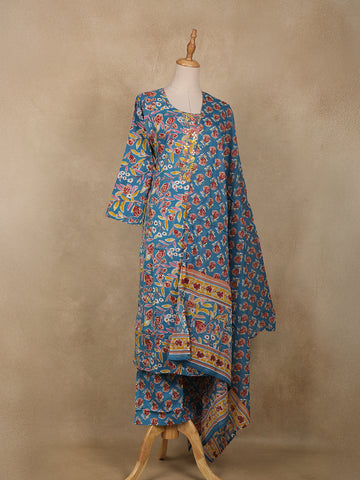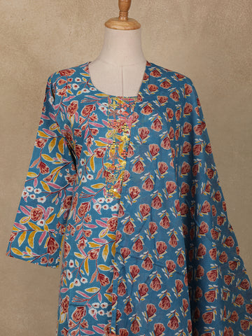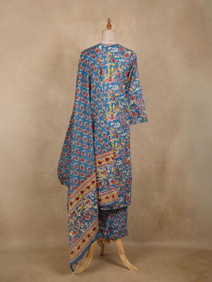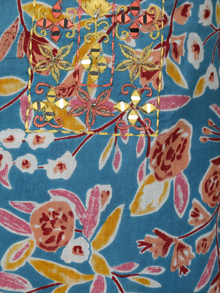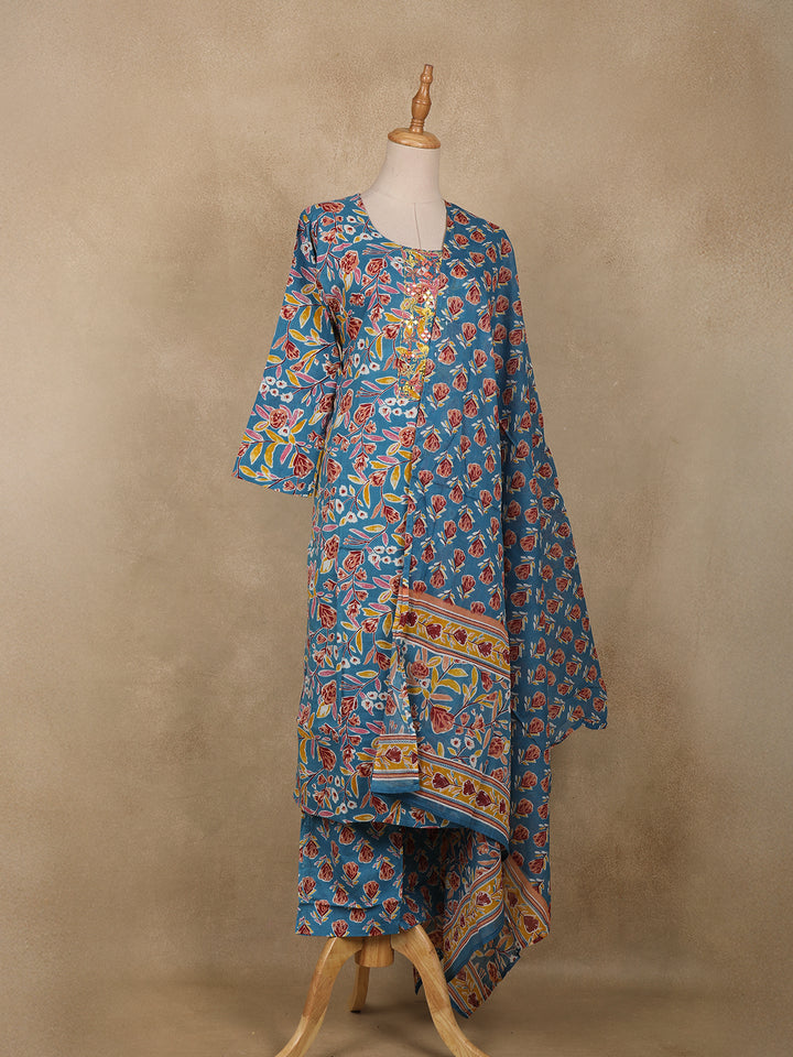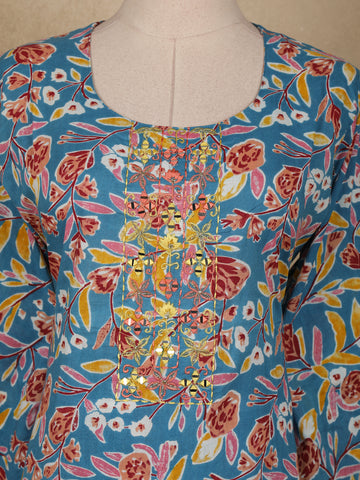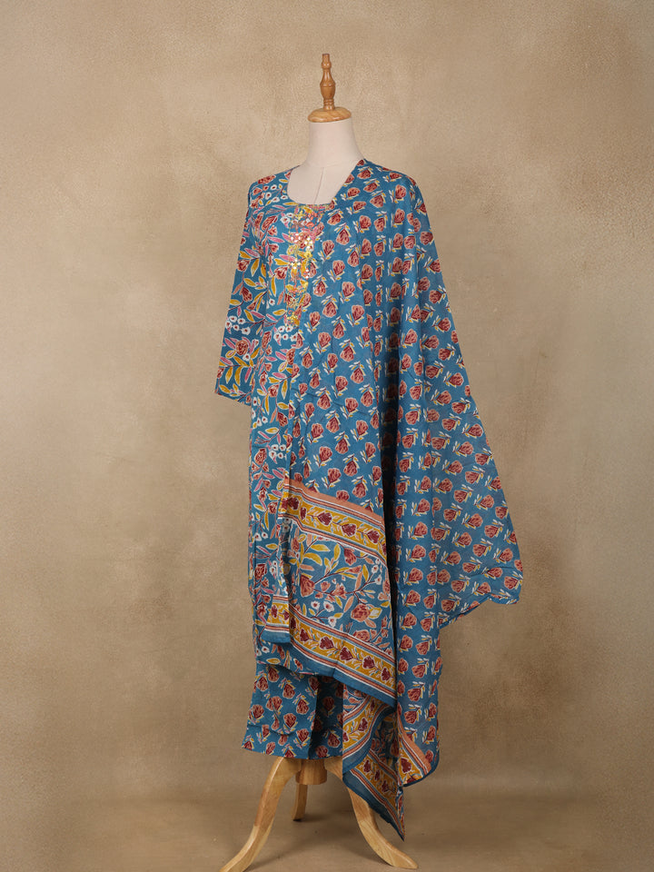 Blue Floral Printed Design Cotton Straight Cut Salwar Suit