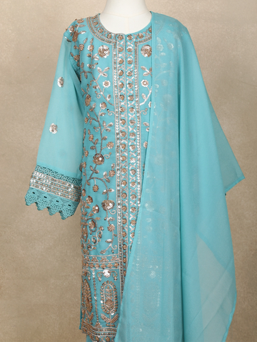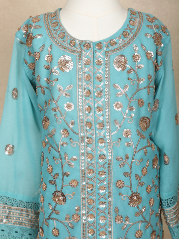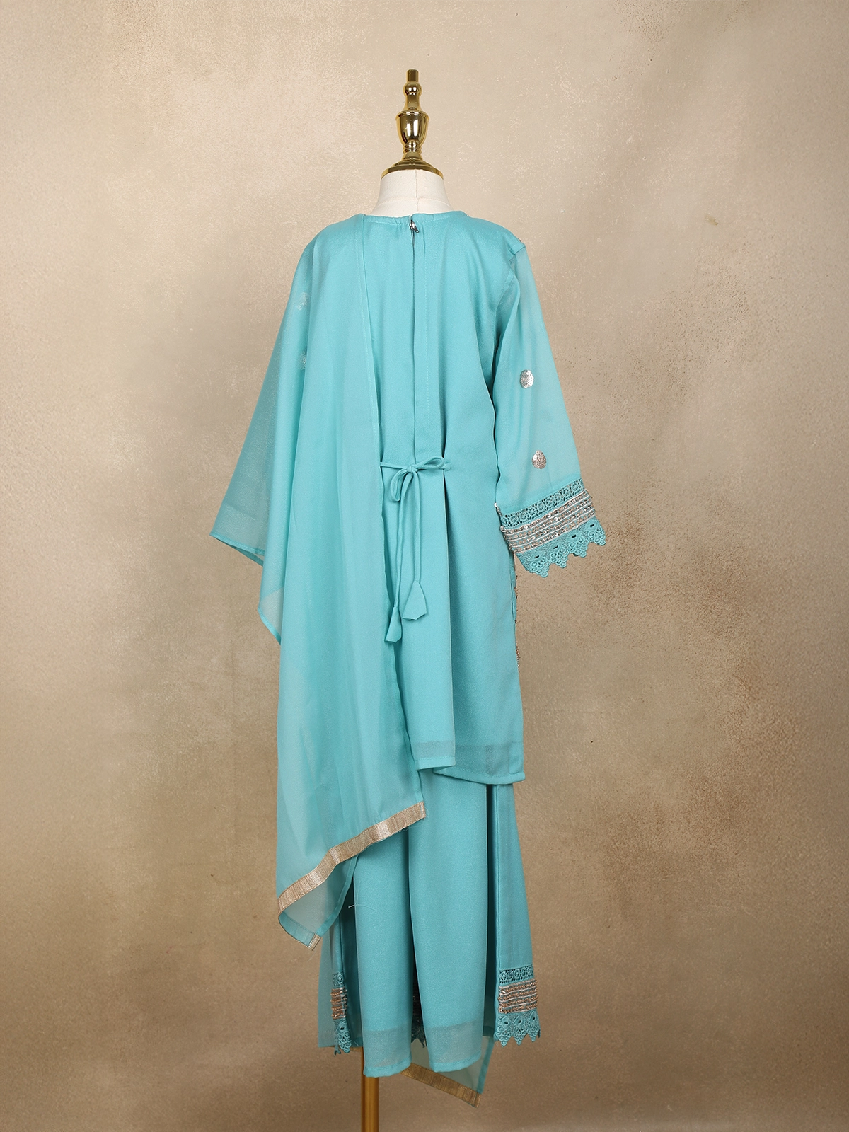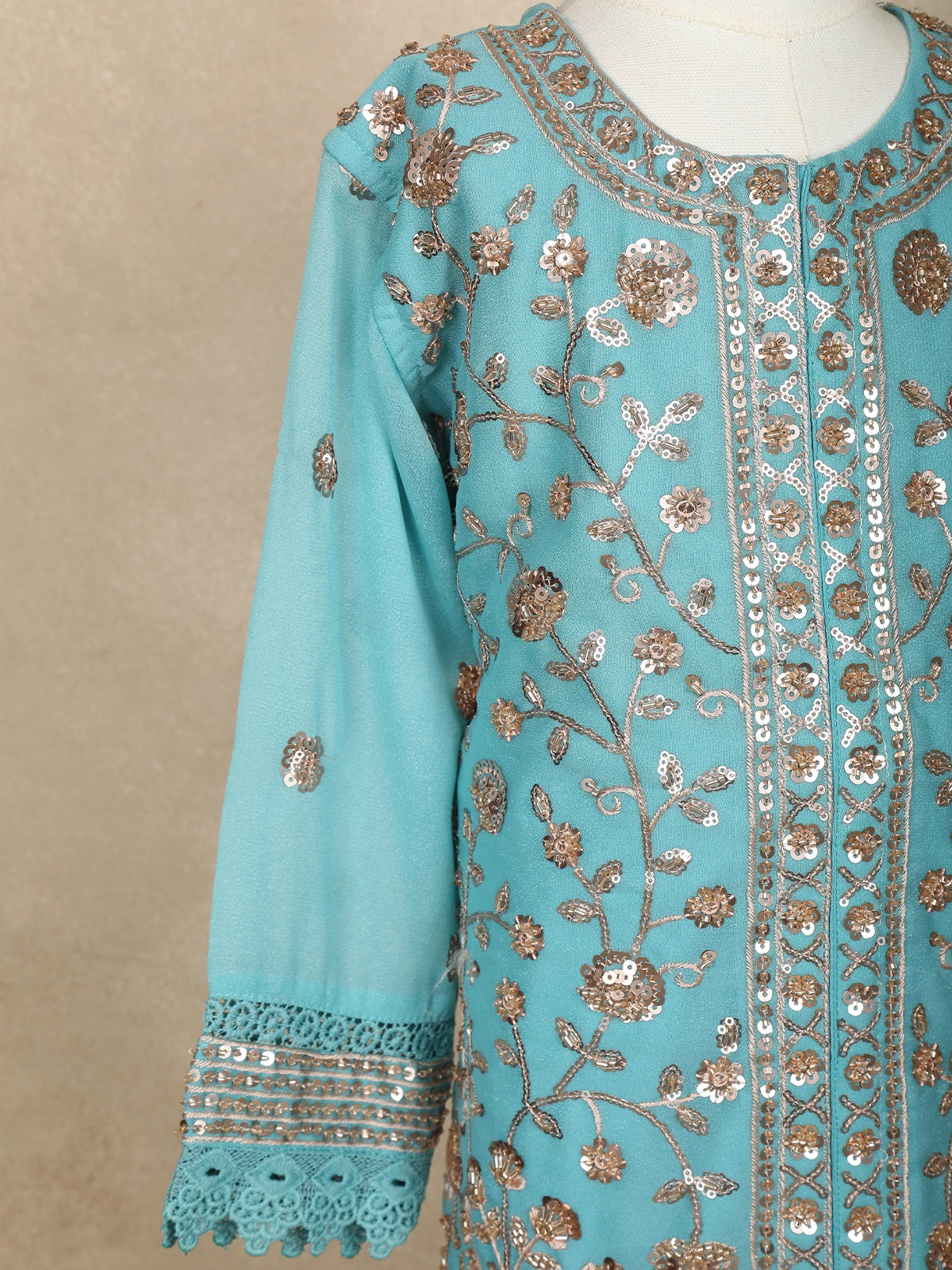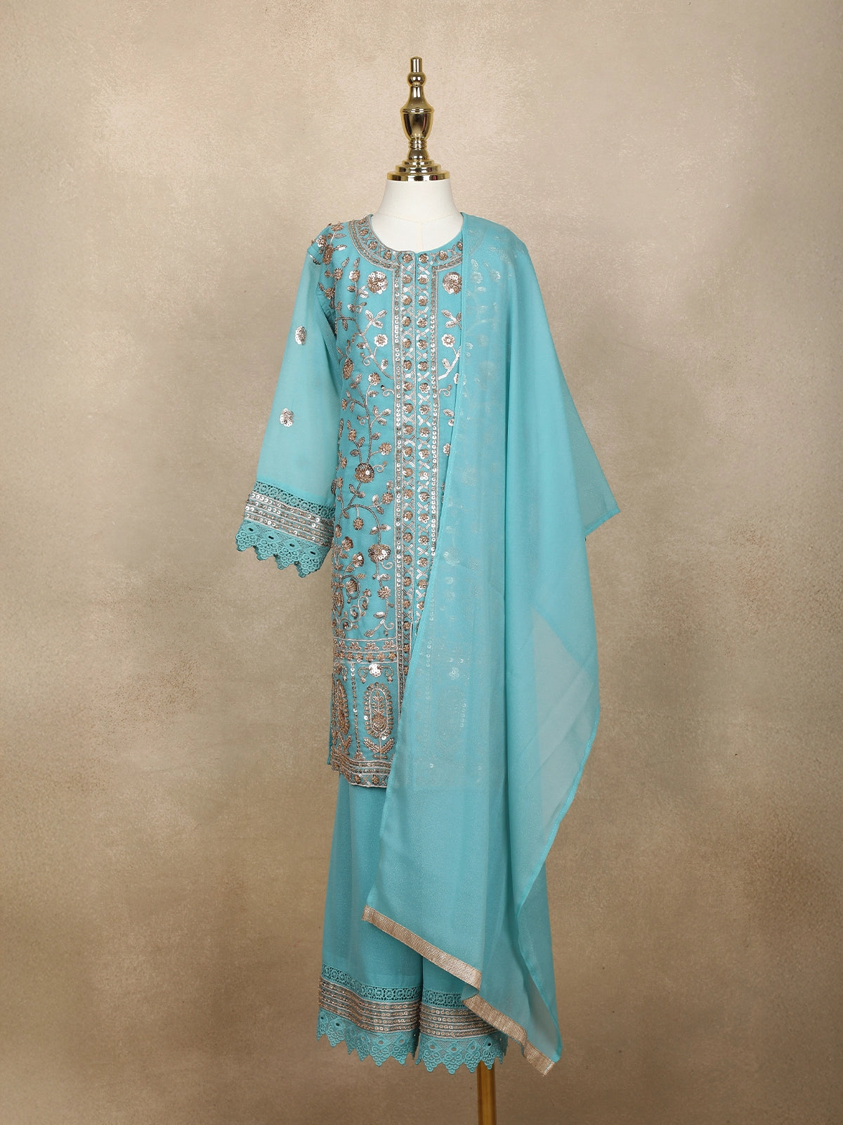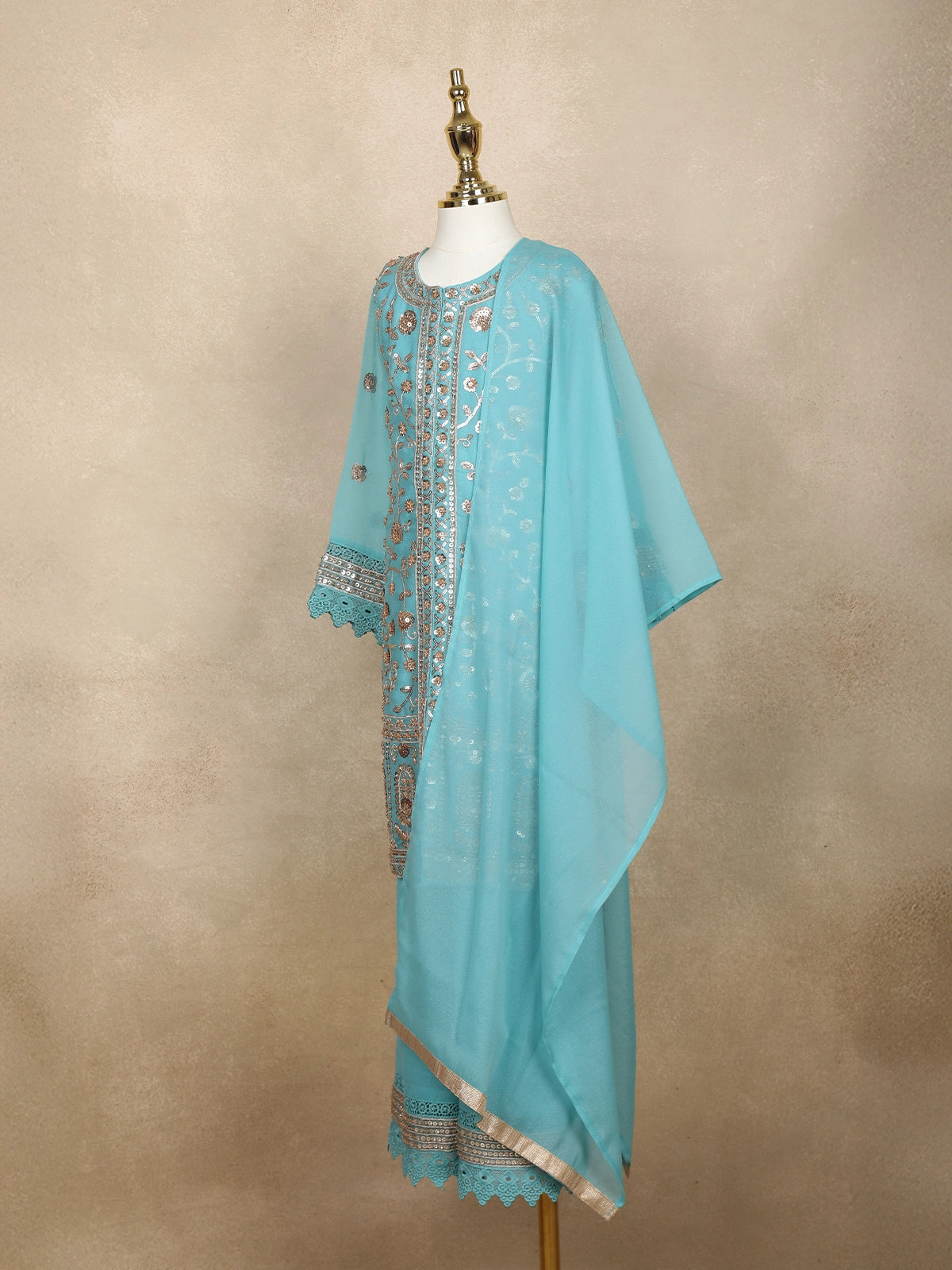 Blue Floral Sequins Embroidered Kids Georgette Palazzo Suit with Dupatta