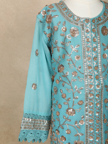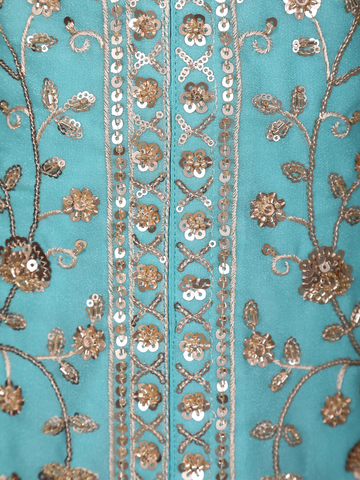 Let your little one shine in this charming Blue Floral Sequins Embroidered Palazzo Suit Set, crafted in soft and flowy georgette fabric. The kurta is adorned with delicate floral motifs, highlighted with sparkling sequins and thread embroidery that add a graceful festive sparkle.
