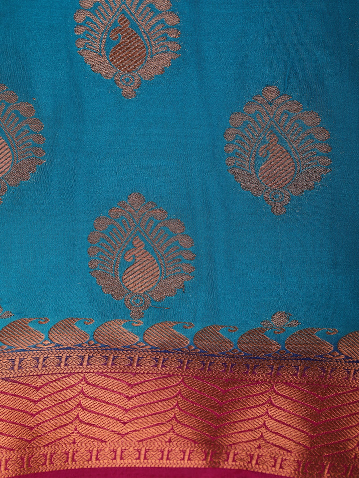 Blue Paisley Woven Mysore Silk Saree With Contrast Pink Zari Border