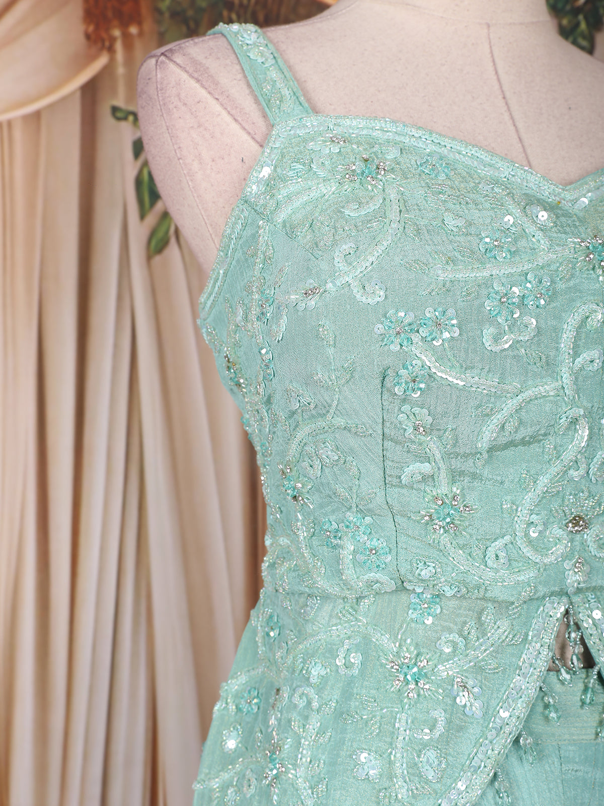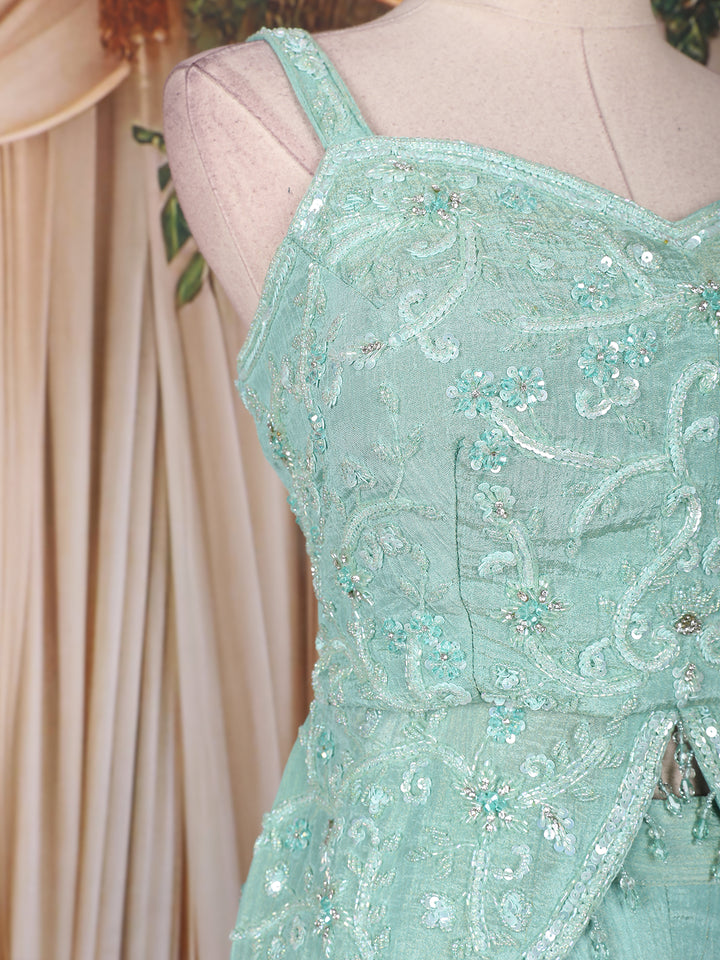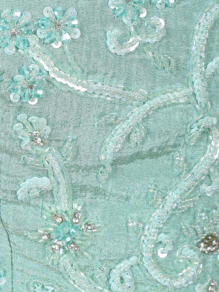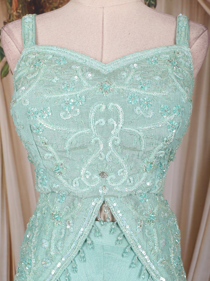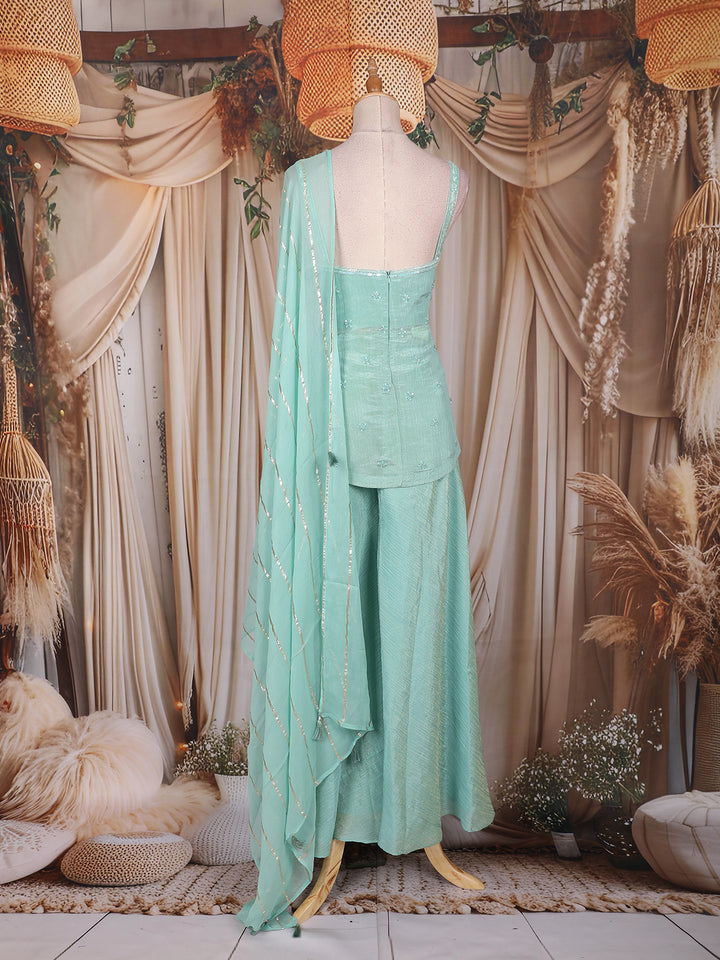 Radiate elegance and charm in this Blue Organza Peplum Palazzo Suit, beautifully detailed with intricate sequin and bead embroidery. The soft organza fabric enhances the outfit with a sheer, graceful appeal, while the sweetheart neckline and sleeveless design add a touch of modern sophistication. The fitted peplum top flares gracefully at the waist, paired with flowing palazzo pants that create a flattering silhouette. A lightweight matching dupatta completes the ensemble, adding a refined traditional finish. Perfect for festive celebrations, receptions, or special occasions, this suit exudes effortless glamour with every step.