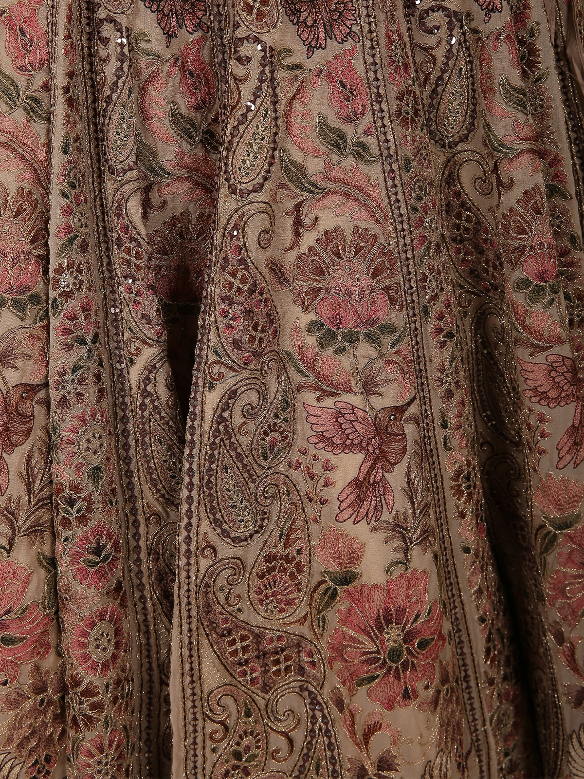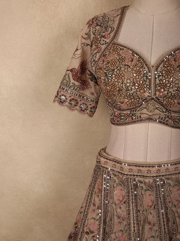 Completing the ensemble is a sheer net dupatta in a matching blush beige tone, delicately embellished with scattered floral buttas and framed with an ornate embroidered border. Draped effortlessly, it adds an ethereal charm and balances the richness of the lehenga.