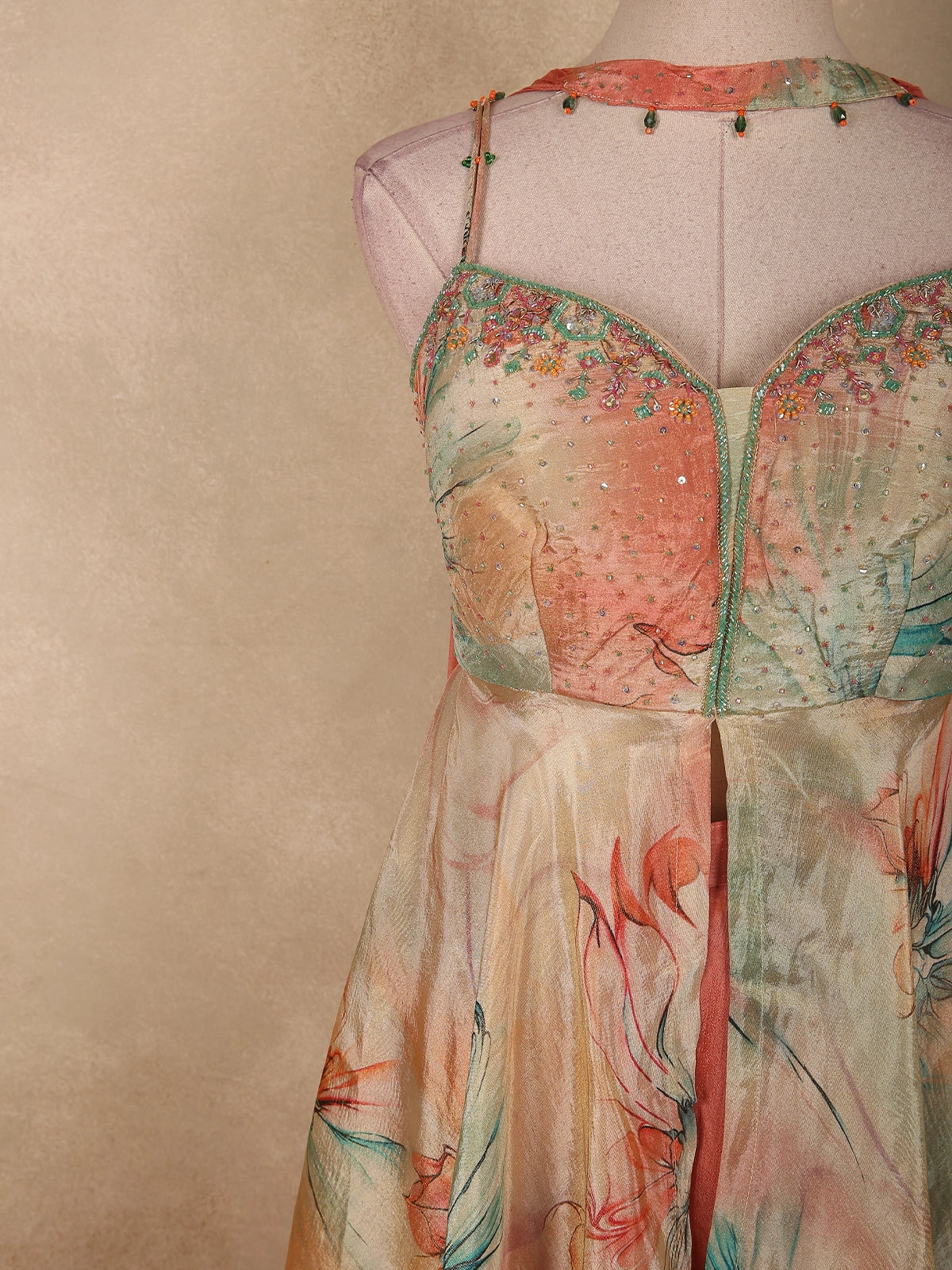 Gracefully blending soft hues with contemporary styling, this Blush Peach abstract printed crepe palazzo suit is designed for effortless elegance. The flowy crepe kurta features an artistic abstract floral print in soothing shades of blush peach, ivory, and subtle aqua accents, creating a light and refreshing visual appeal. The delicately embellished neckline with fine bead detailing adds a hint of shimmer, elevating the overall look.