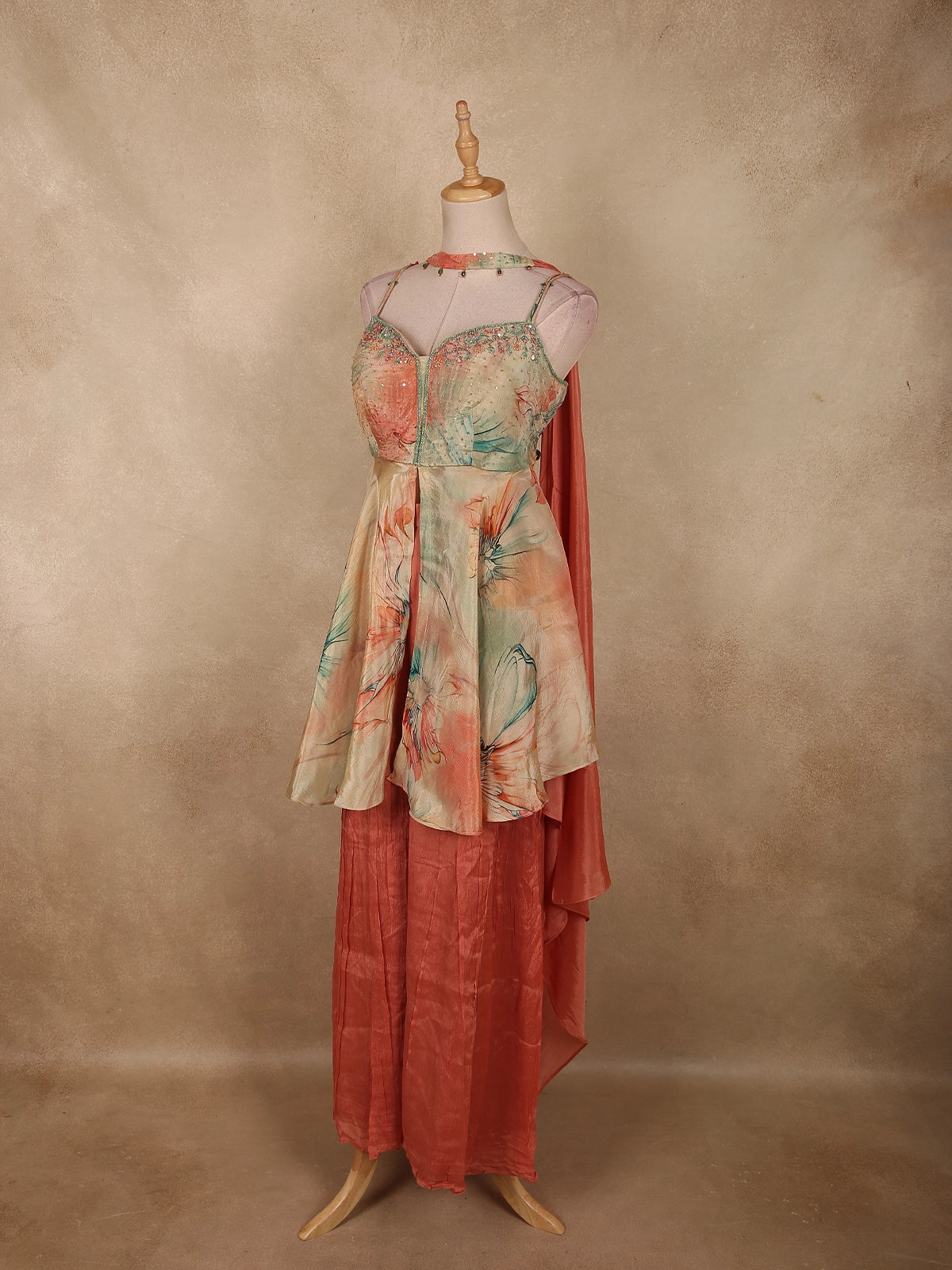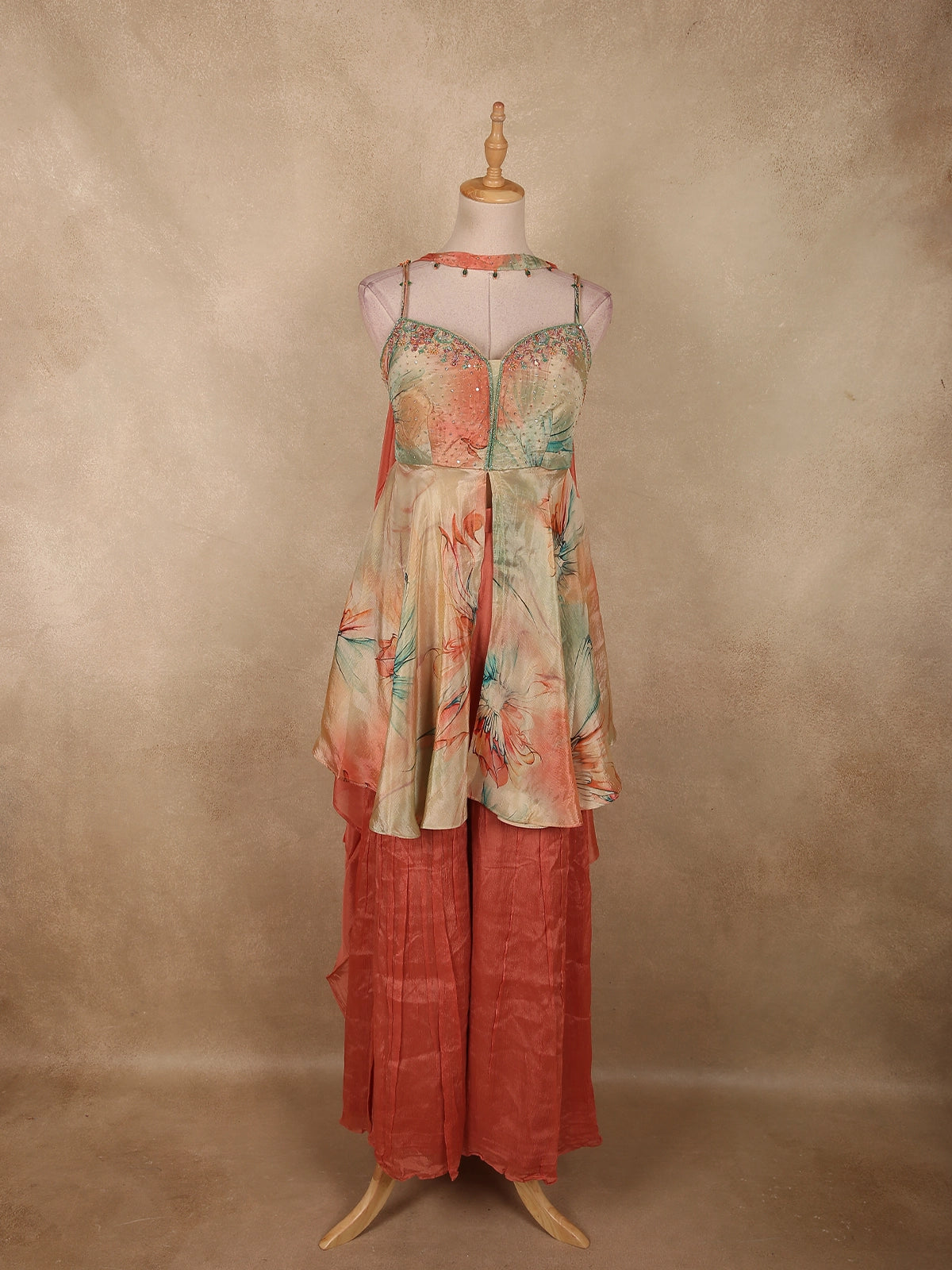 Ideal for daytime celebrations, festive gatherings, brunches, or resort occasions, this palazzo suit is a perfect choice for those who appreciate modern prints, pastel elegance, and effortless charm.