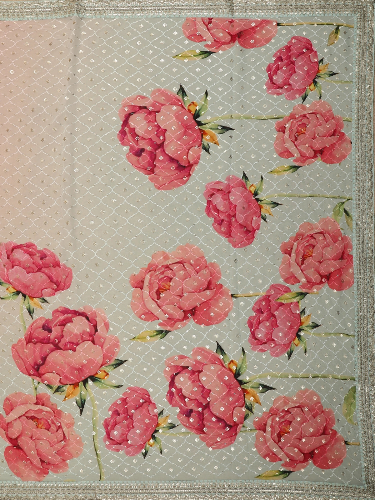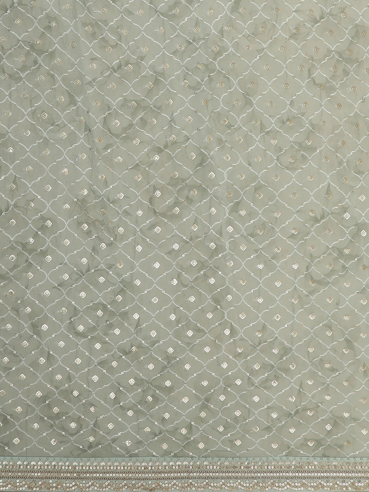 The saree body features a romantic floral print in shades of blush pink with hints of green, delicately scattered across the fabric. A subtle diamond lattice pattern runs throughout the saree, highlighted with fine sequin embellishments that add a gentle shimmer, enhancing the overall look without overwhelming its softness.
