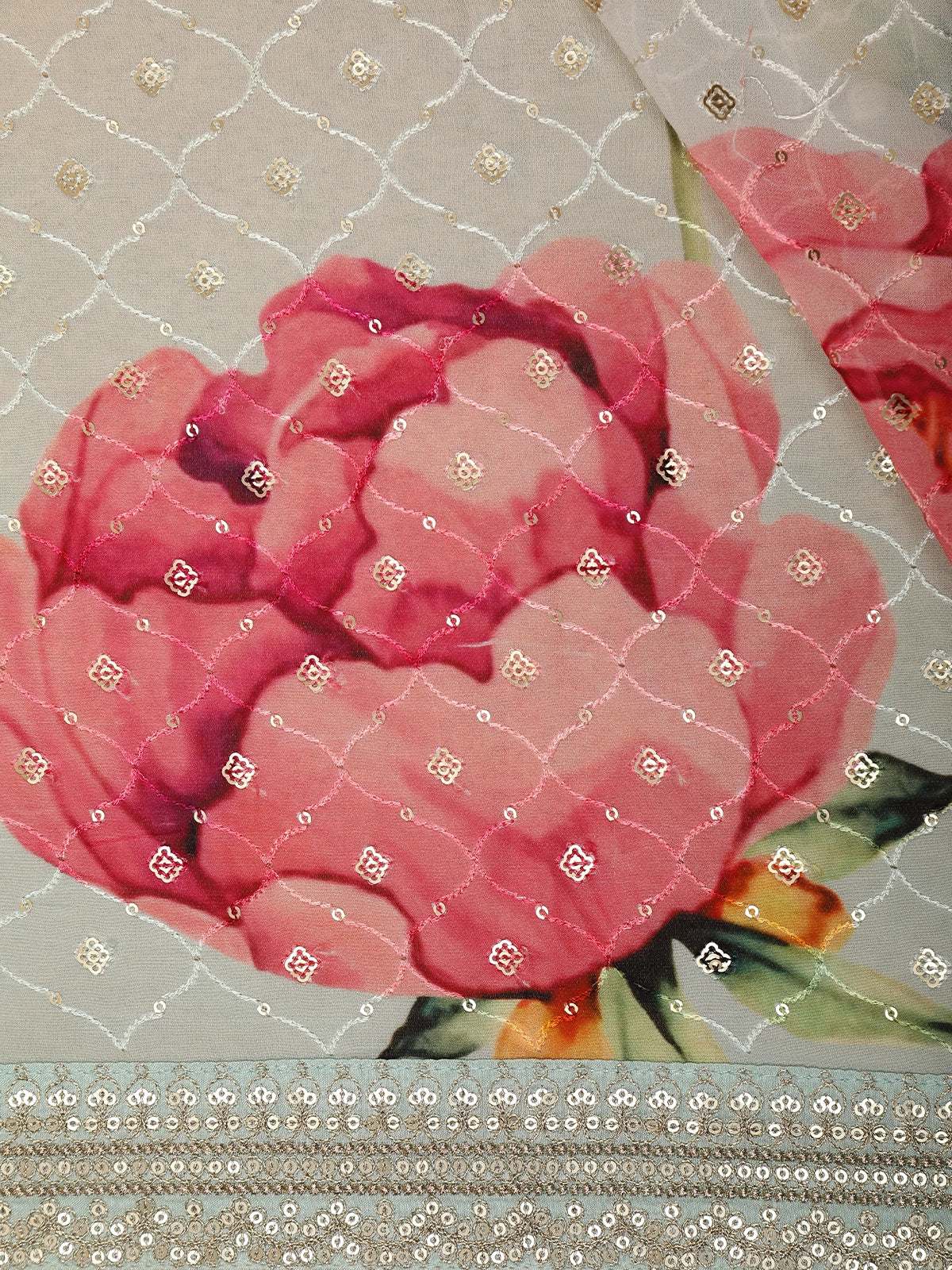 Blush Pink and Grey Floral Sequins Embellished Design Georgette Saree with Embroidered Border