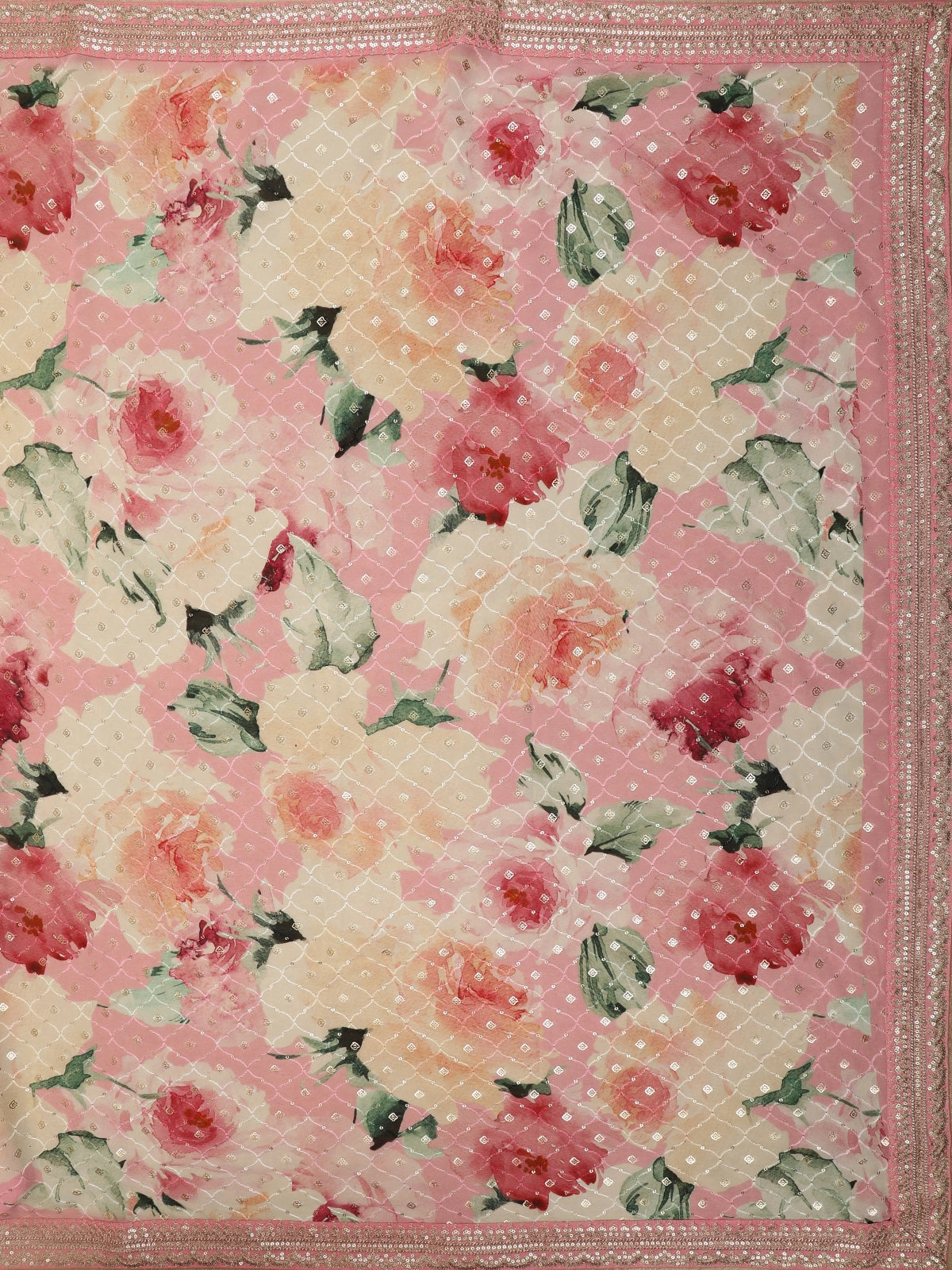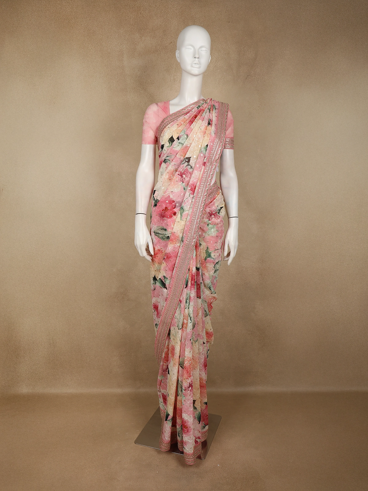 Blush Pink and Grey Floral Sequins Embellished Design Georgette Saree with Embroidered Border