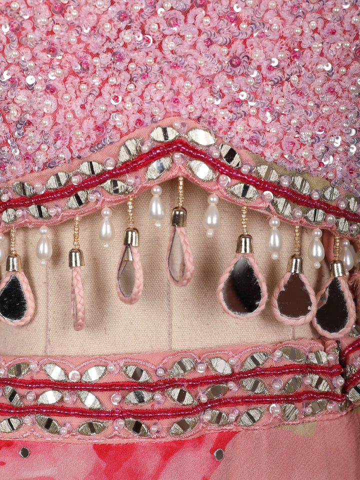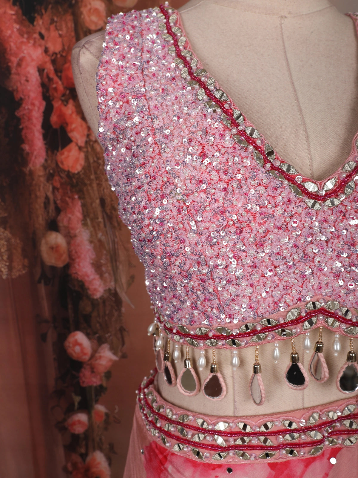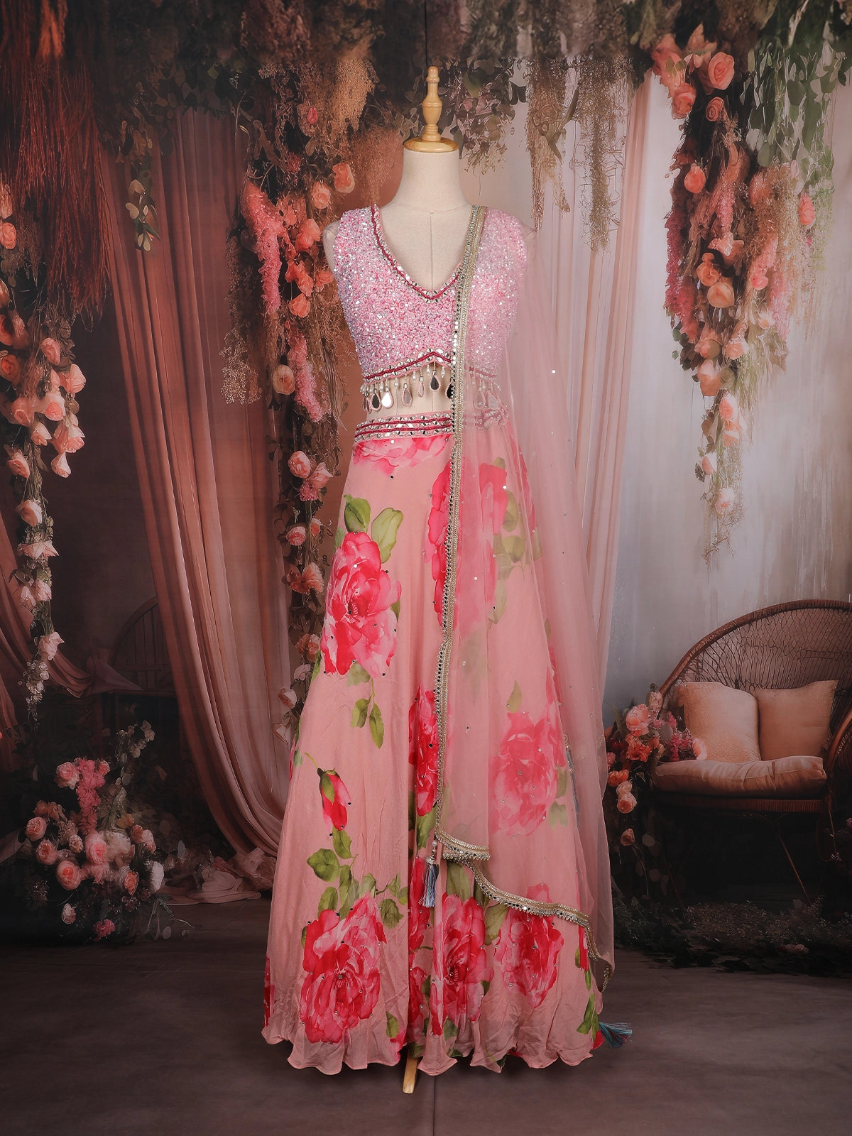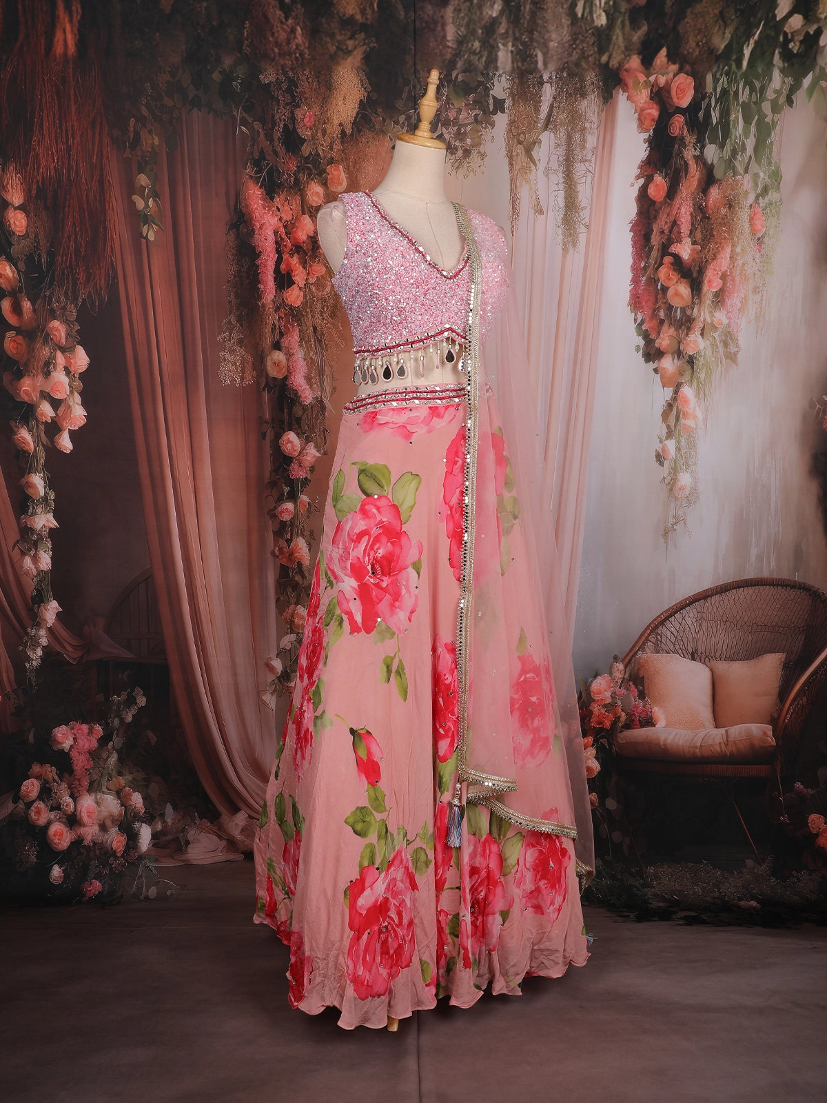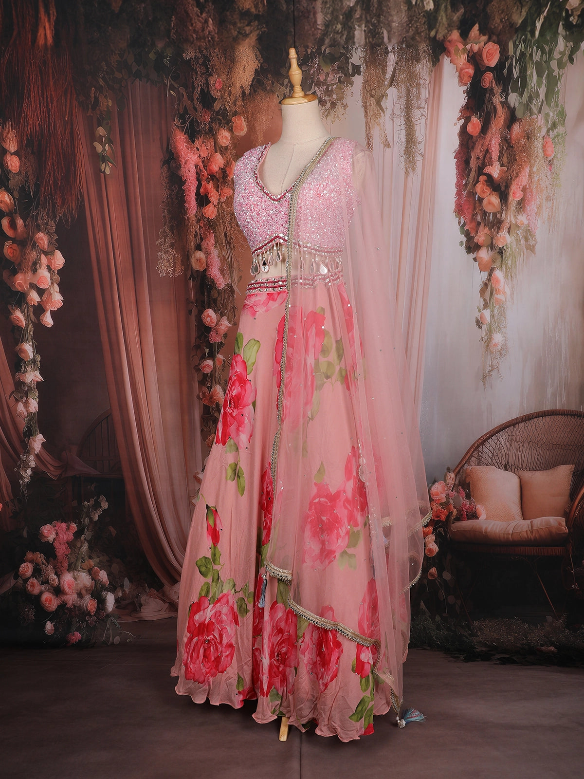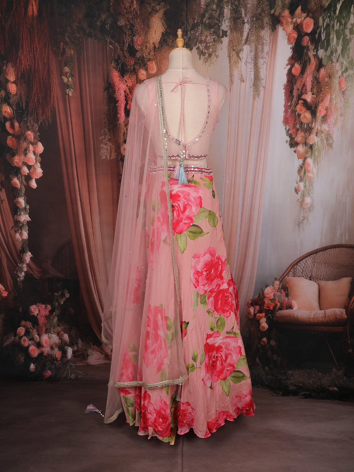 Blush Pink Floral Printed Organza Lehenga with Net Dupatta
