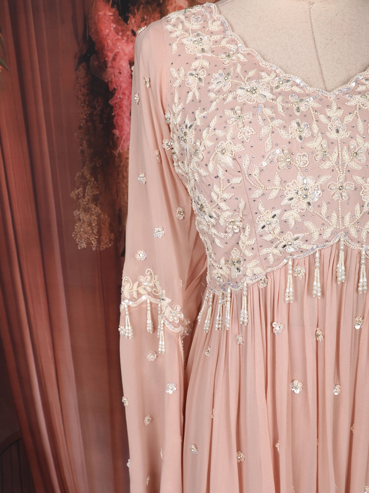 The yoke is beautifully highlighted with handcrafted detailing and dainty tassel bead drops, bringing a touch of luxury to the silhouette. The full sleeves carry scattered embroidered motifs, maintaining the elegant and minimal aesthetic.