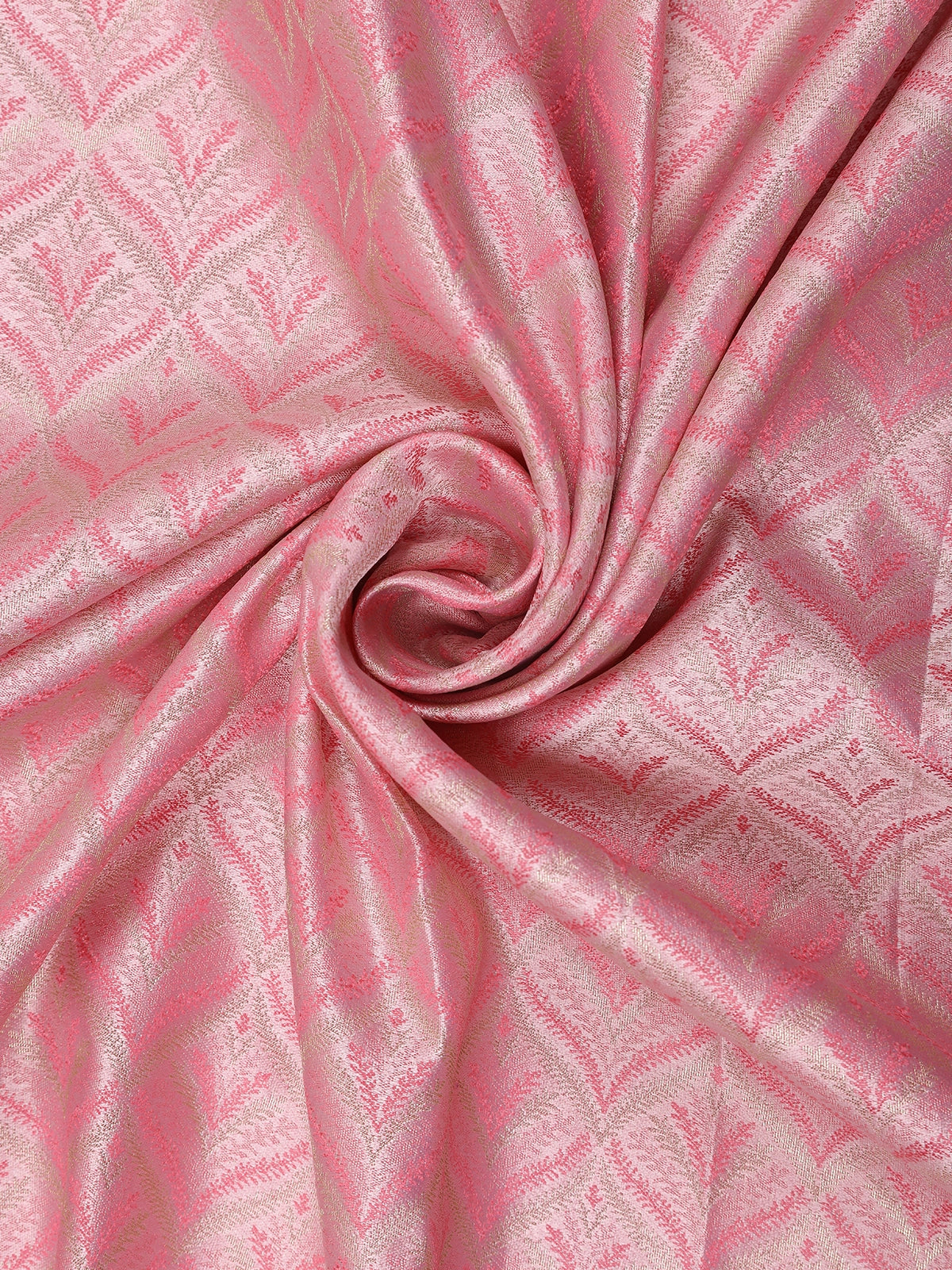 Step into timeless elegance with this Blush Pink Banarasi Silk Saree, exquisitely woven with intricate leaf motifs that symbolize grace and purity. The luxurious silk fabric gleams with a soft sheen, enhanced by fine zari weaving that lends a royal charm to every fold. The saree features a meticulously adorned border, decorated with tiny sequins and delicate zari work, adding a subtle sparkle perfect for festive and wedding occasions.