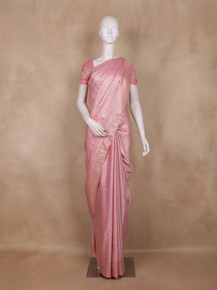 The matching pink blouse complements the drape beautifully, while the smooth pallu completes the ensemble with understated sophistication.