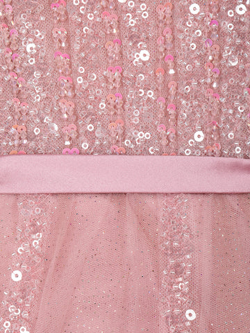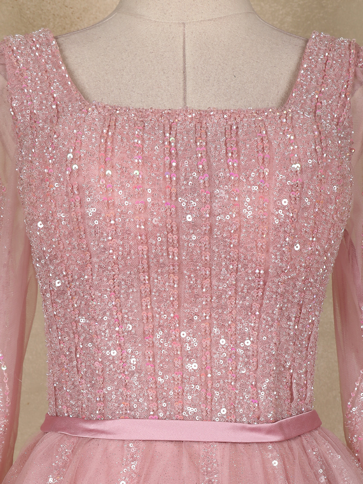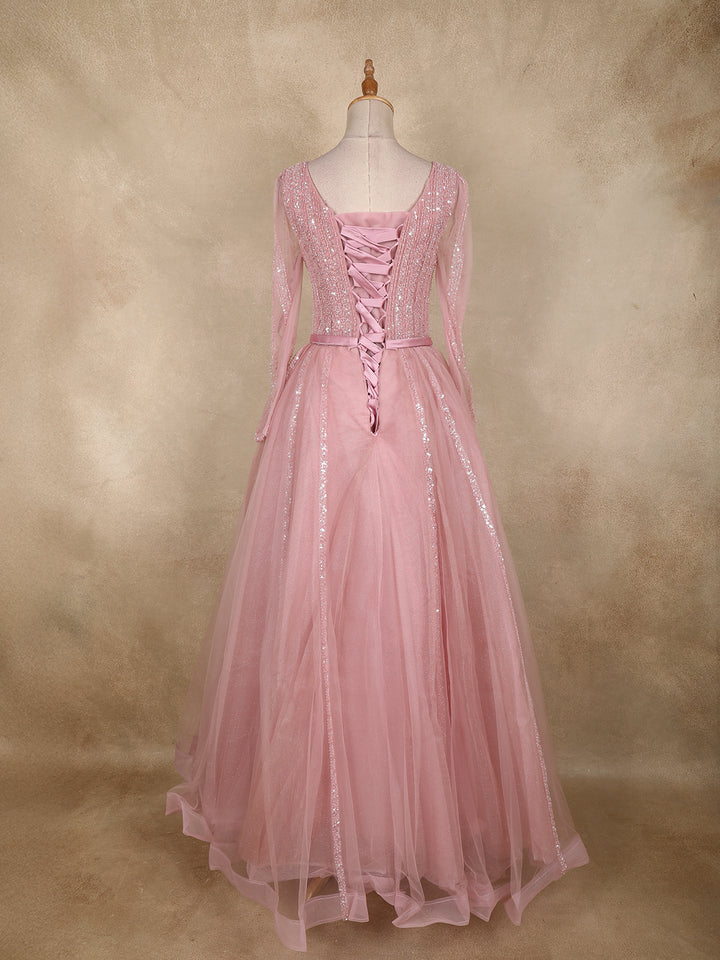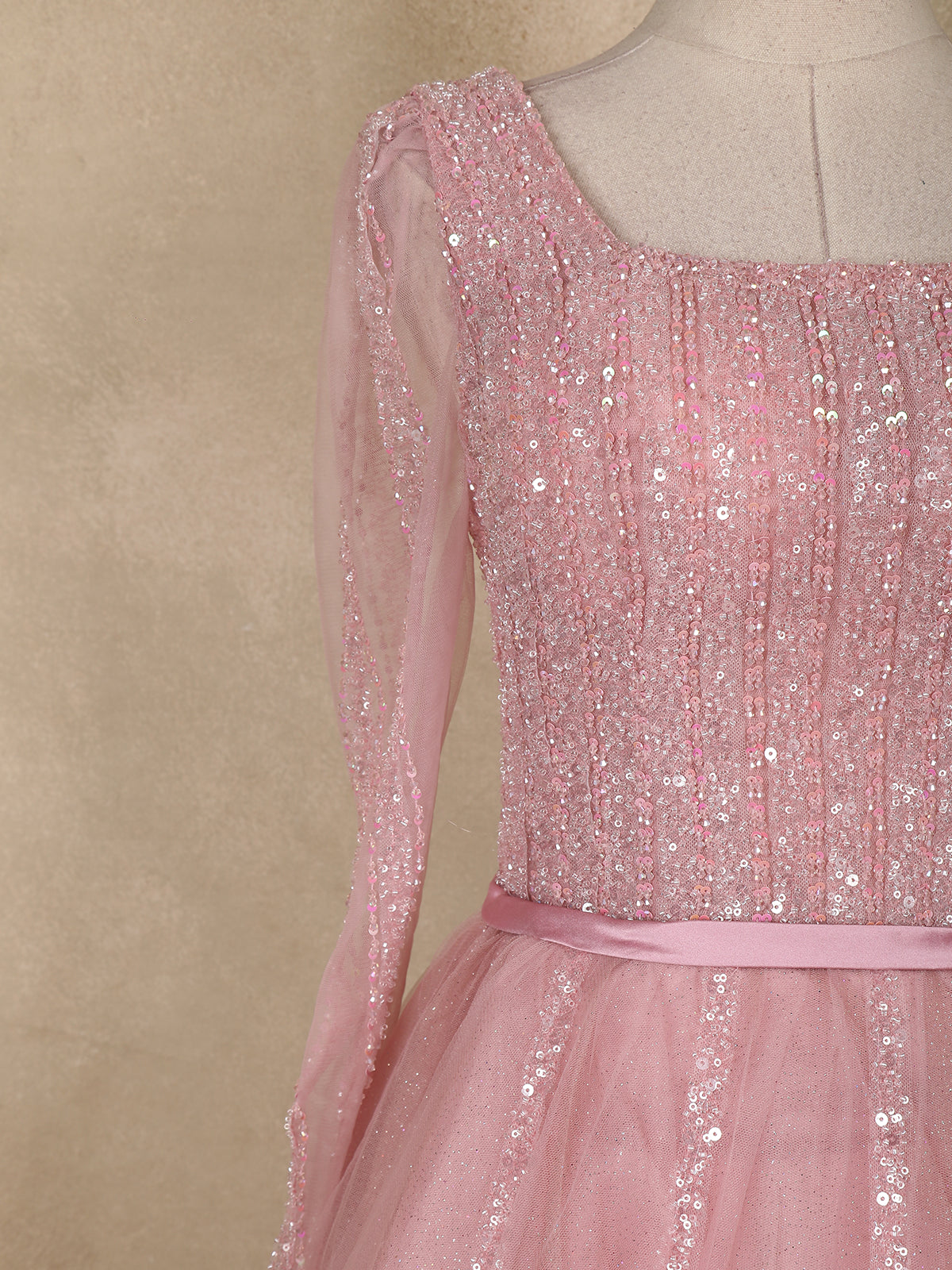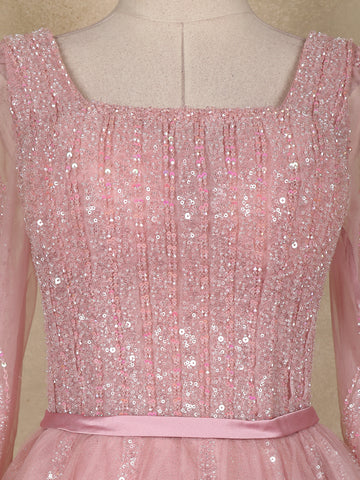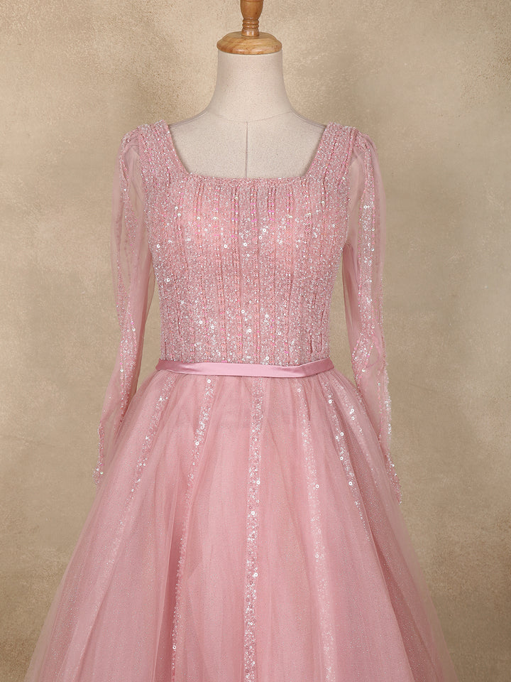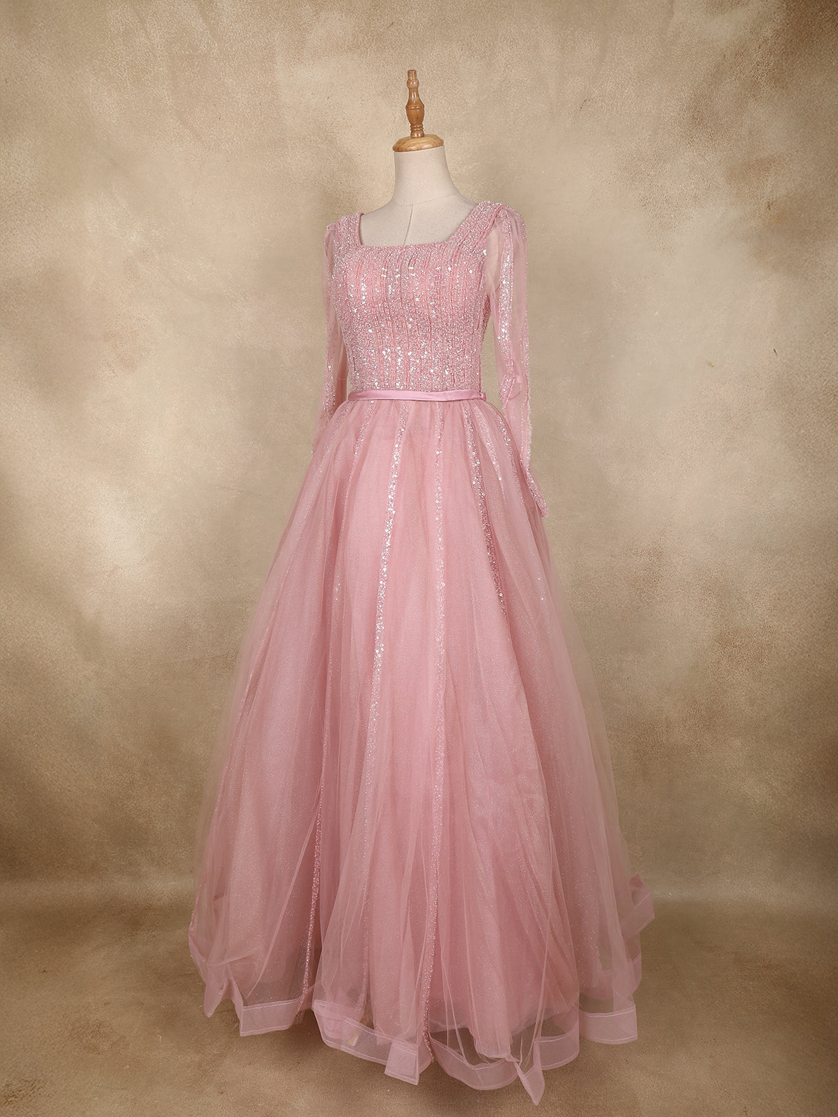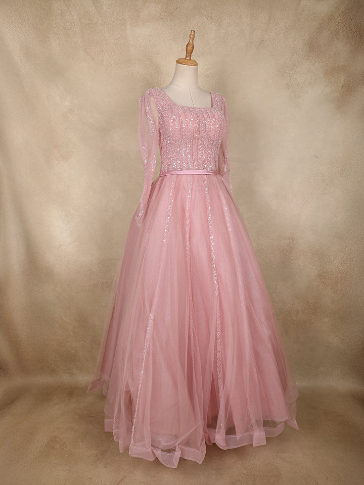 Bring a touch of fairytale elegance to your celebration with this enchanting blush pink net gown. Designed with exquisite attention to detail, the bodice is beautifully embellished with shimmering sequins and delicate beads, creating a sparkling and sophisticated look. The square neckline and sheer full sleeves offer a graceful feminine charm.