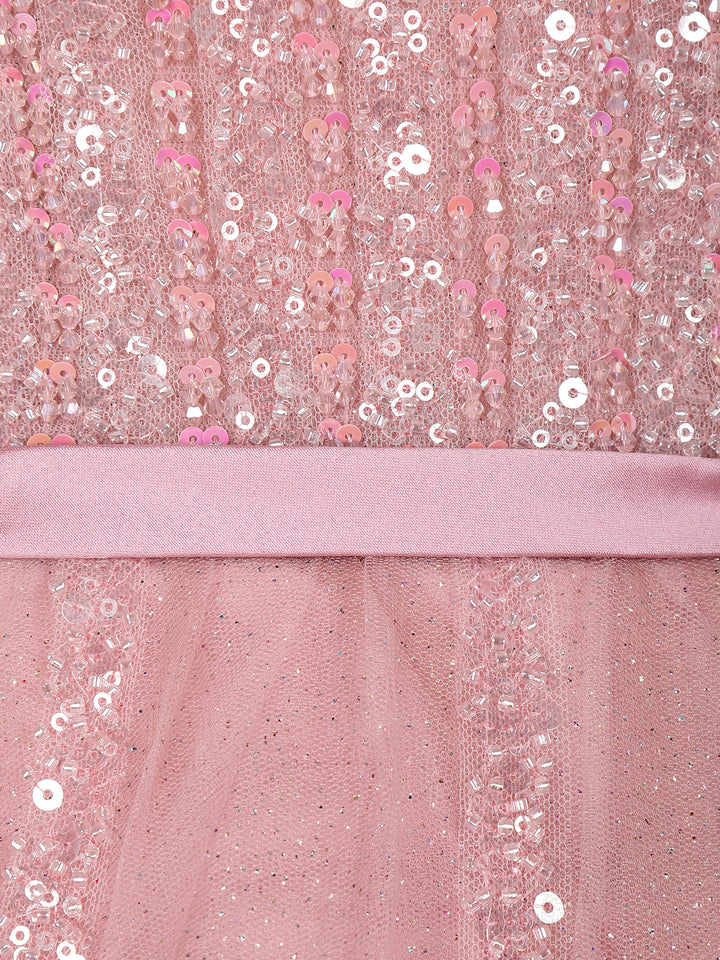 The layered soft net skirt flows into a voluminous silhouette enhanced with subtle shimmer and vertical lines of sequins, adding definition and a princess vibe to the gown. The lace-up back ensures a customizable fit, beautifully accentuating the figure while offering comfort throughout the event.