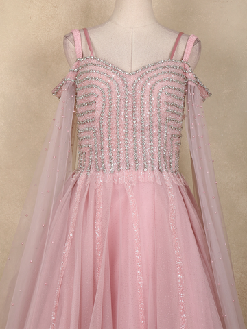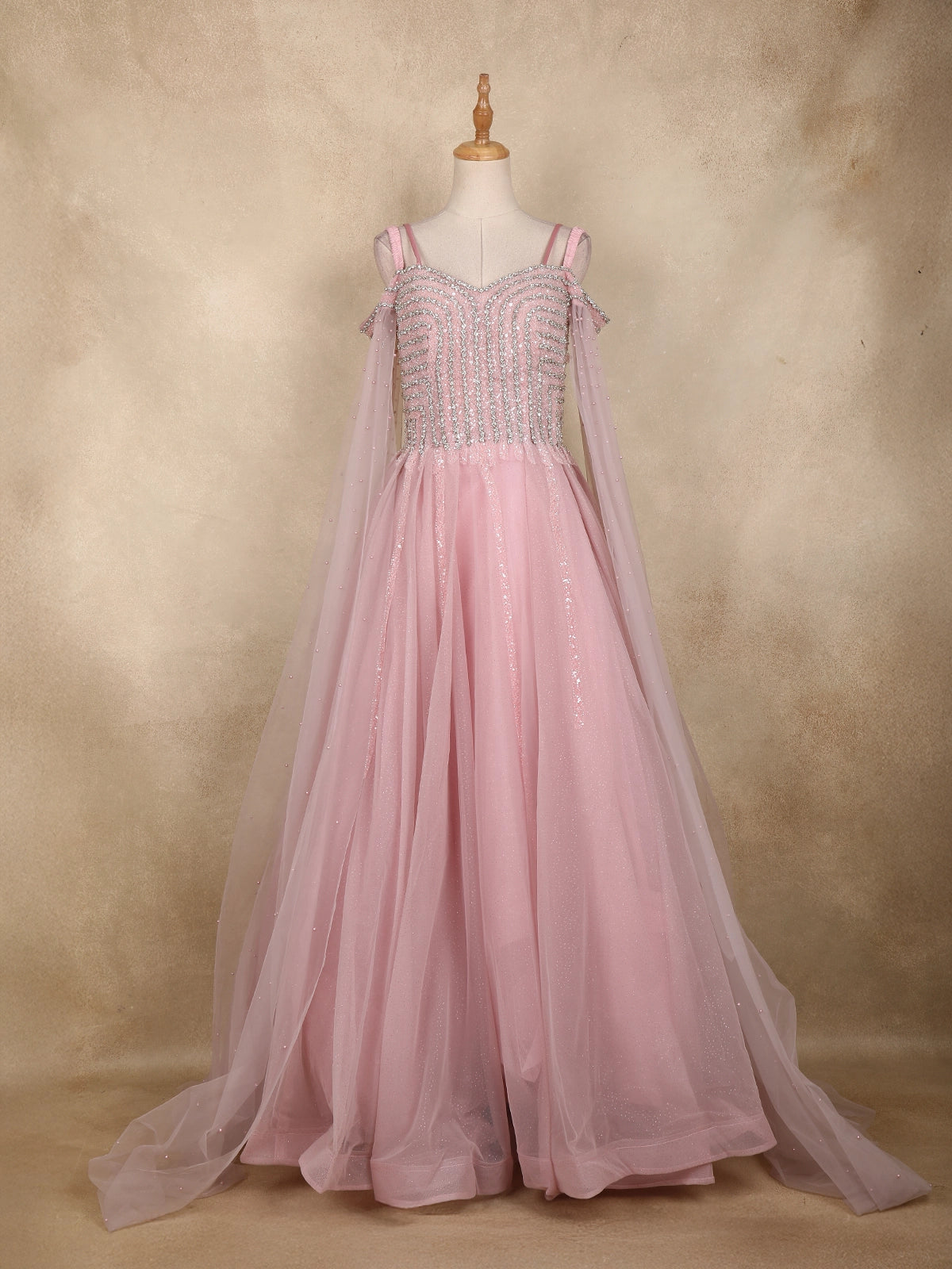 Blush Pink Sequins Embellished Net Partywear Gown with Cape Sleeves