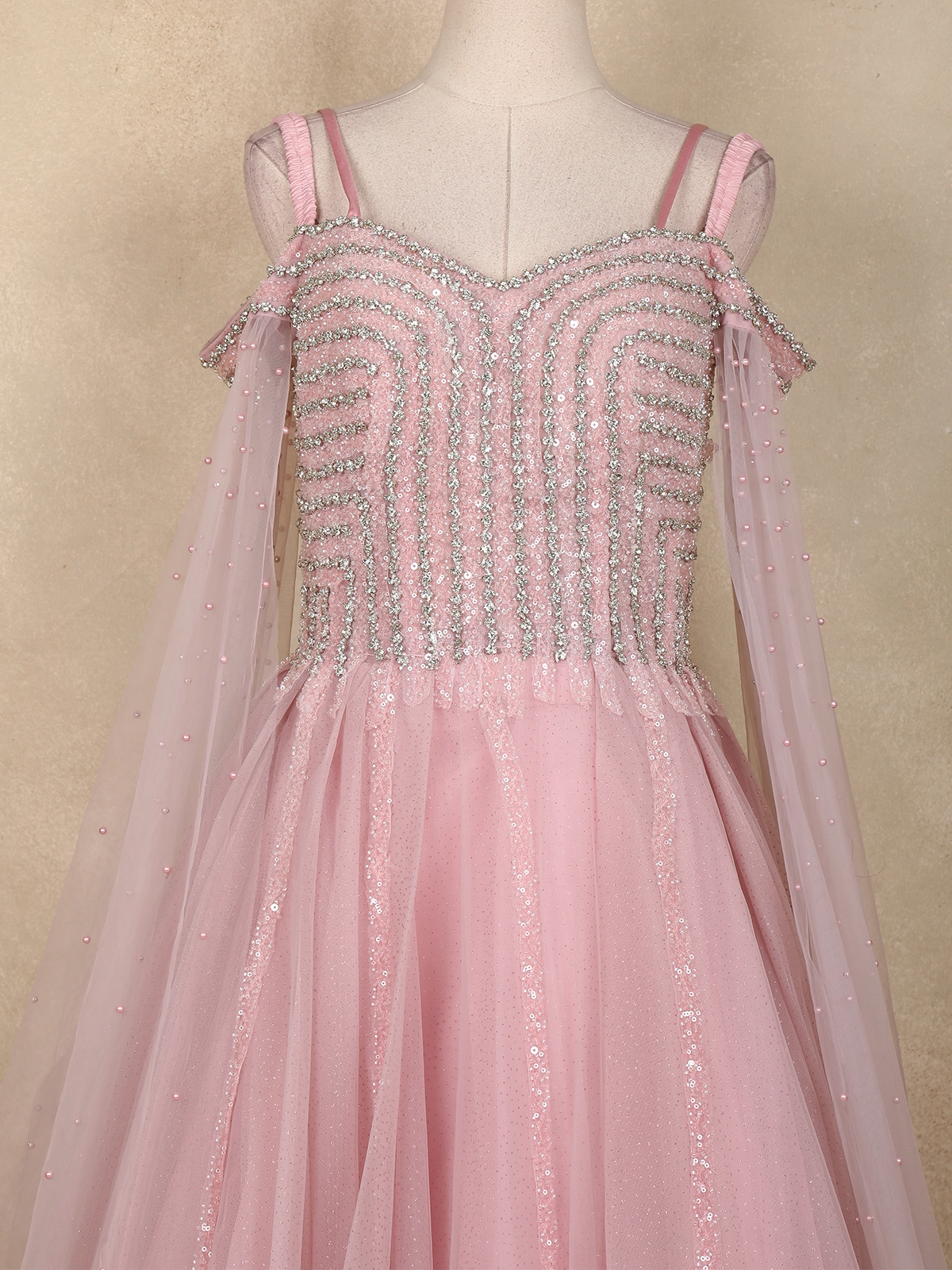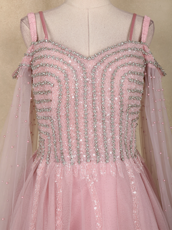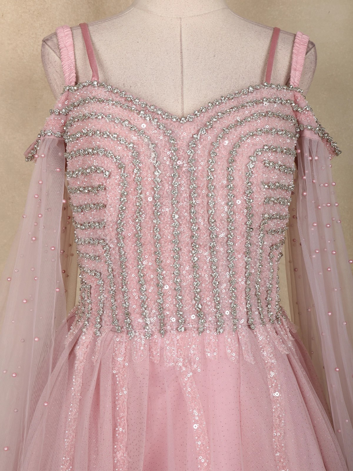 A dreamy fairytale look for your little princess! This blush pink girls gown is designed with a sparkling sequins embellished bodice that adds the perfect amount of shimmer for every celebration. The sweetheart neckline and stylish cold-shoulder pattern bring a trendy and elegant touch, while the delicate cape sleeves with tiny pearl accents create a magical flow with every step.