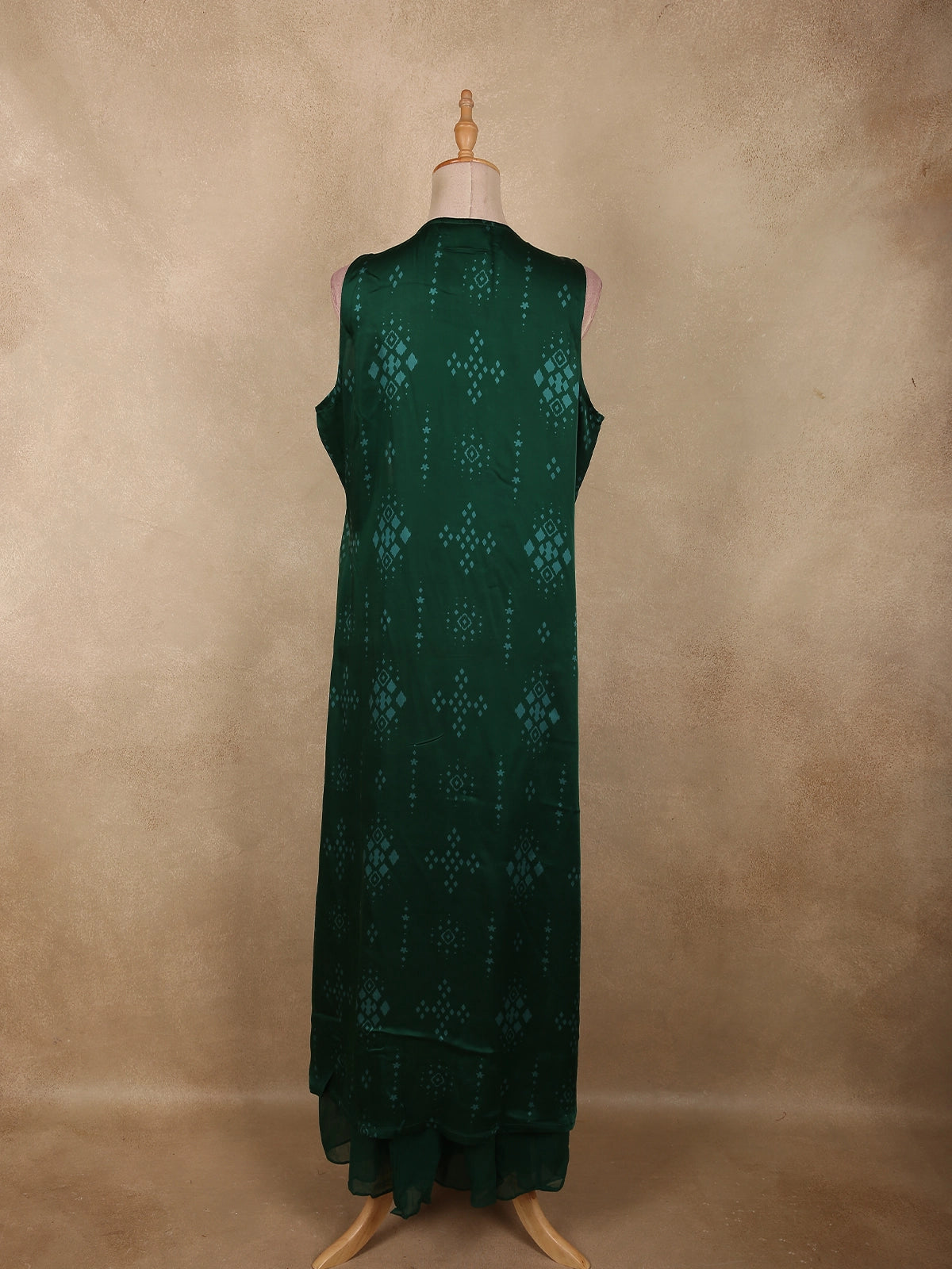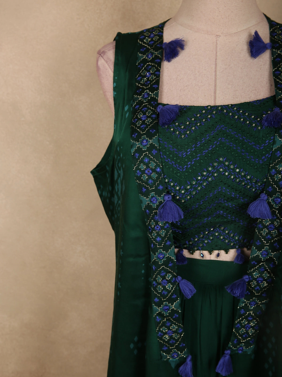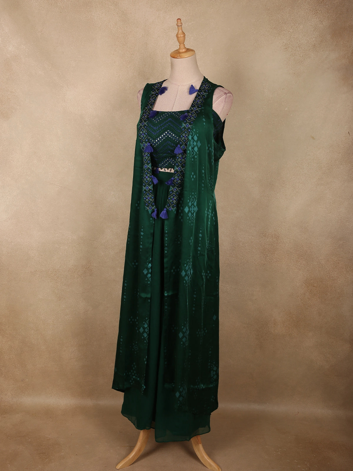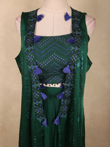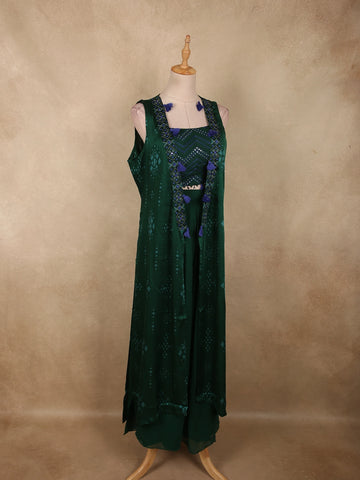 This Bottle Green Abstract Embroidered Design Georgette Palazzo Suit with Coat is a striking blend of festive vibrance and contemporary ethnic elegance. The ensemble features a beautifully embroidered cropped top adorned with intricate abstract patterns, highlighted with delicate threadwork and playful tassel detailing that adds charm and texture to the look.