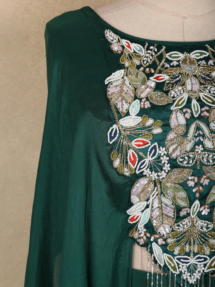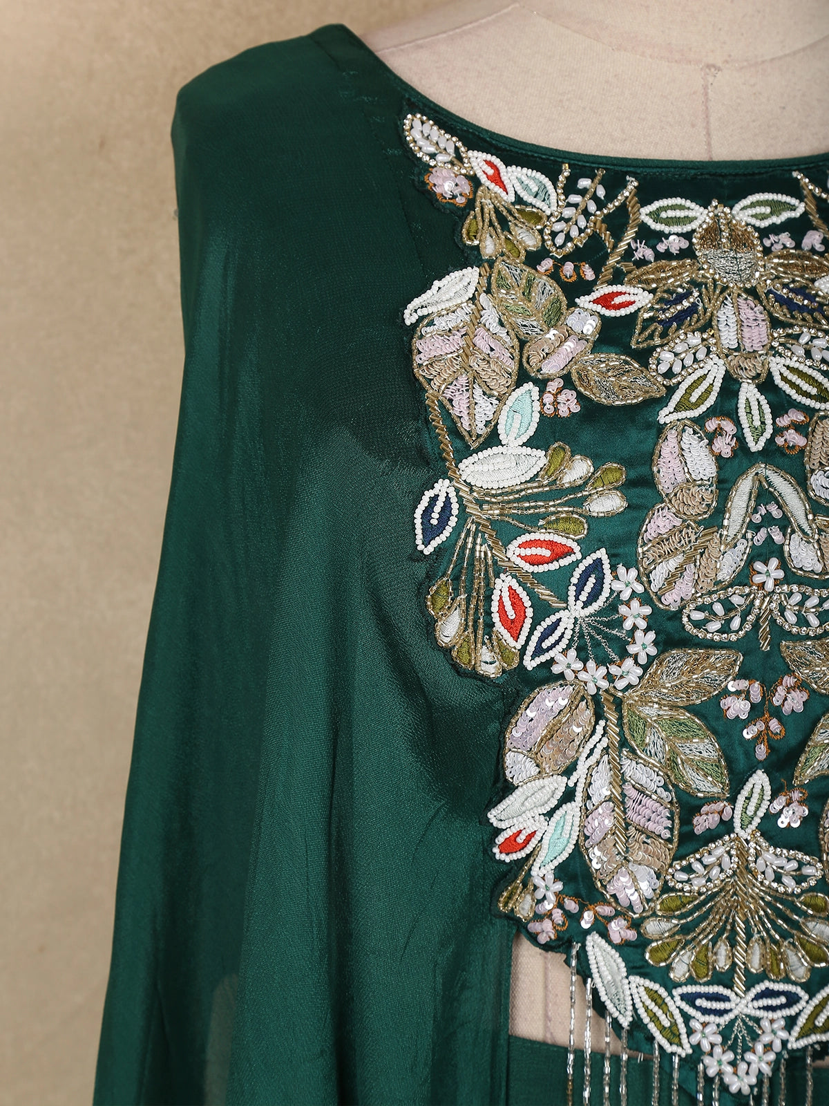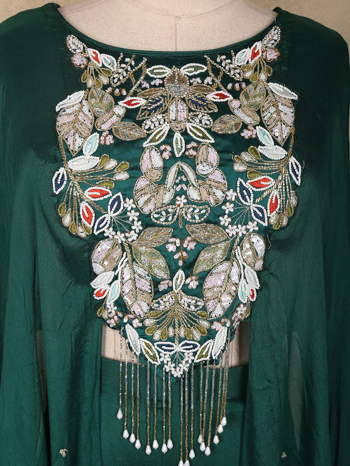 Bottle Green Beads and Stones Embroidered Design Chiffon Crop Top with Palazzo Suit