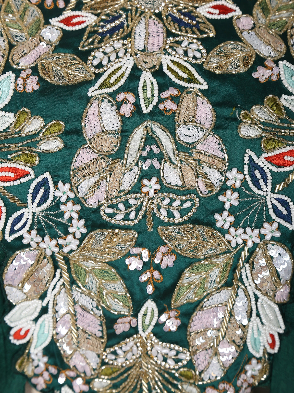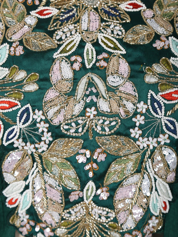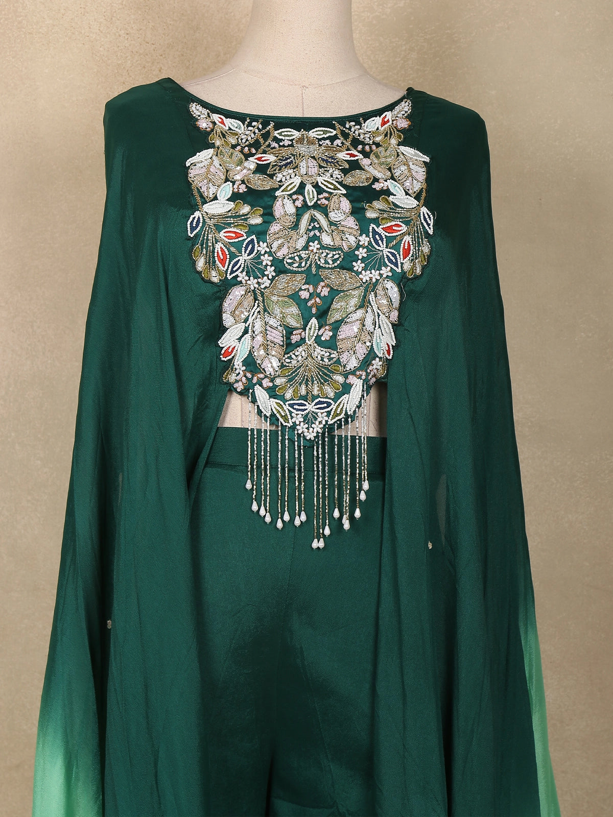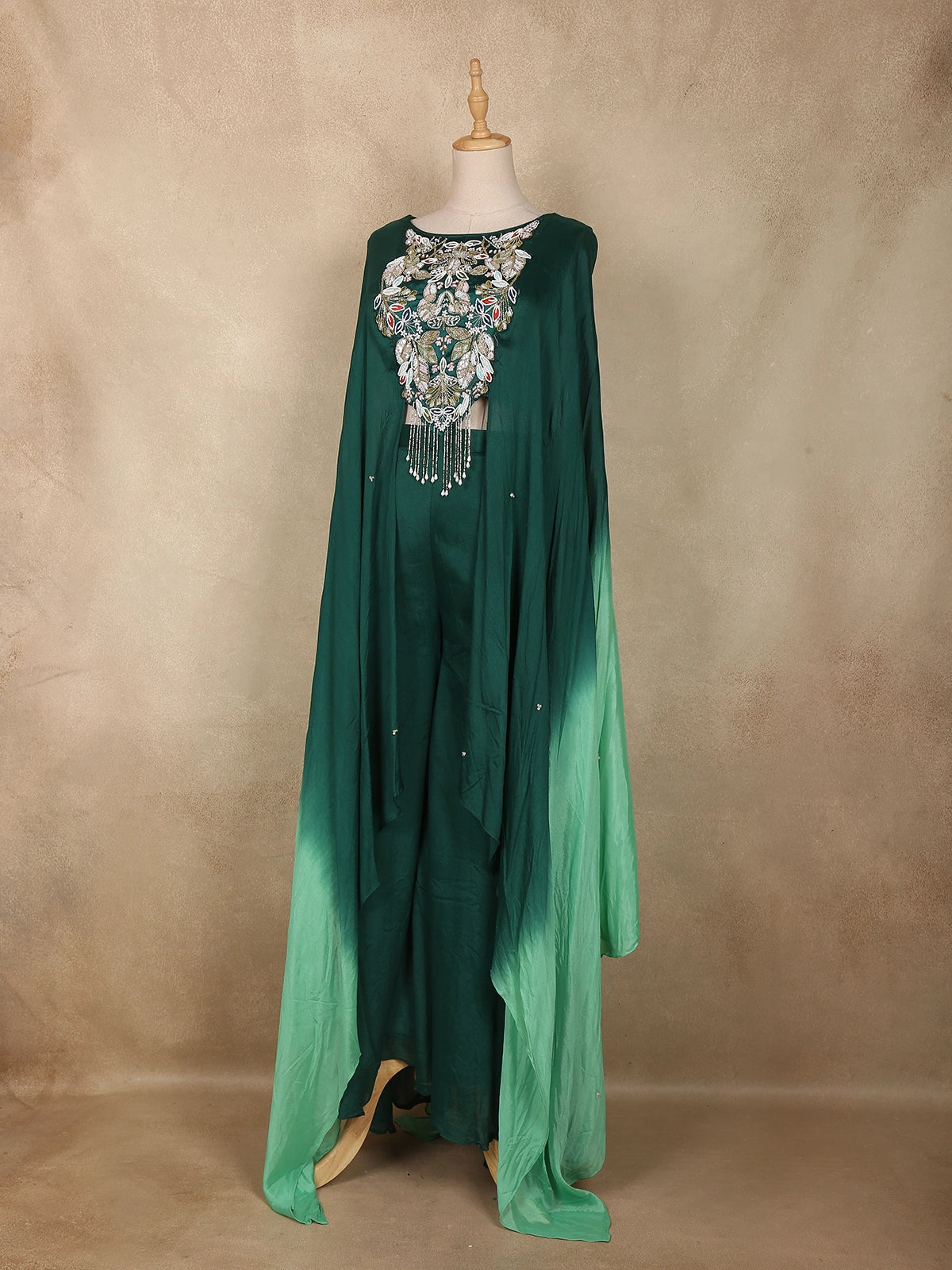 Bottle Green Beads and Stones Embroidered Design Chiffon Crop Top with Palazzo Suit