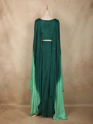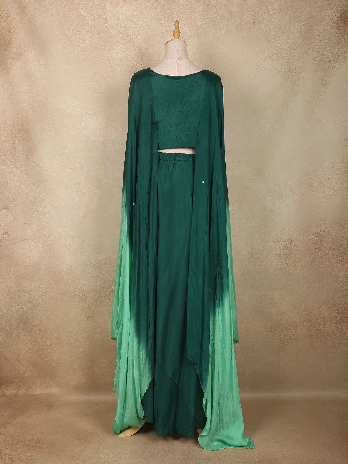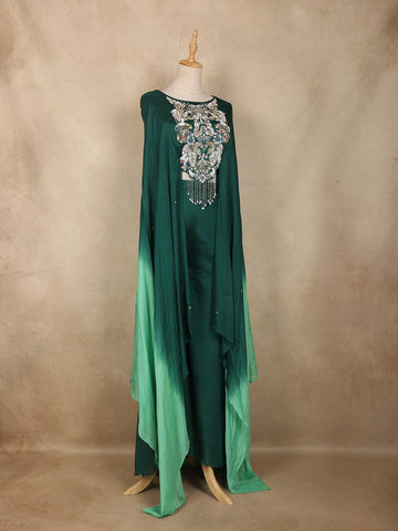 Radiate contemporary elegance with this Bottle Green Beads and Stones Embroidered Chiffon Crop Top with Palazzo Suit, a masterpiece that captures modern luxury and ethnic artistry. Designed in an ombre-shaded hue, this ensemble exudes a graceful drape and regal charm, perfect for evening soirées and festive occasions.