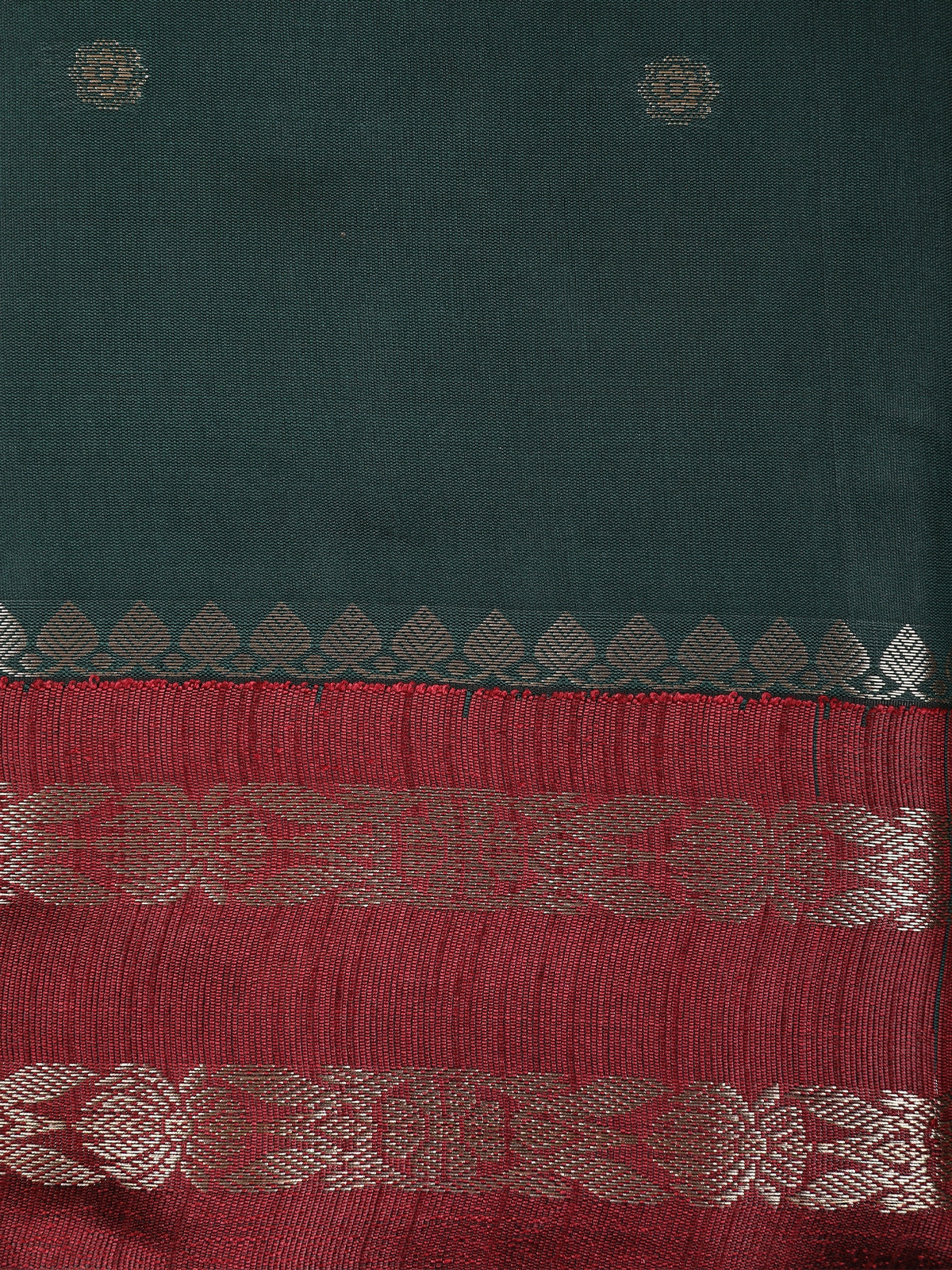 The saree is accentuated with a striking maroon contrast zari border, intricately woven with elegant floral and leaf patterns that create a graceful visual contrast against the dark green backdrop. The lustrous soft silk fabric offers a smooth texture and fluid drape, ensuring both comfort and sophistication throughout the day.