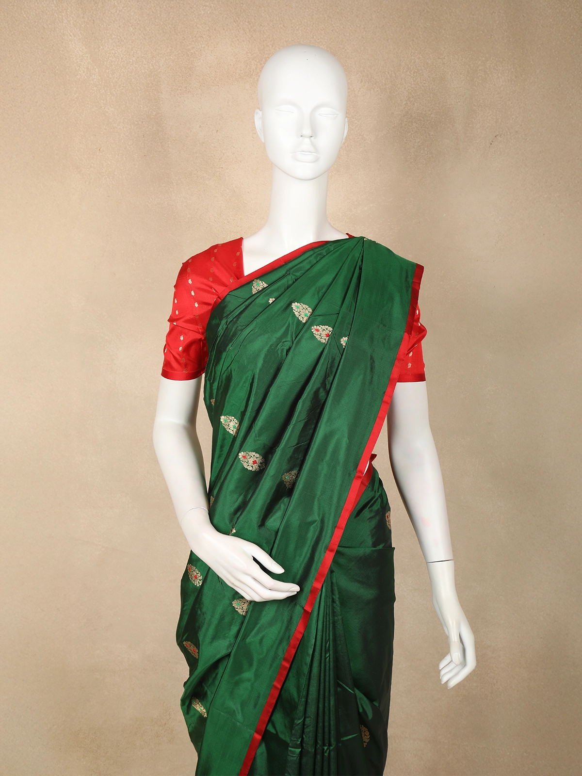 Adorned with delicate golden butta woven motifs across the body, the saree brings together subtle charm and cultural opulence. The classic contrast red border, embellished with intricate zari weaving, adds a vibrant and festive touch, perfectly balancing the serene beauty of the green base. The pallu continues the zari artistry, creating a graceful flow and elevating the saree’s regal appeal.