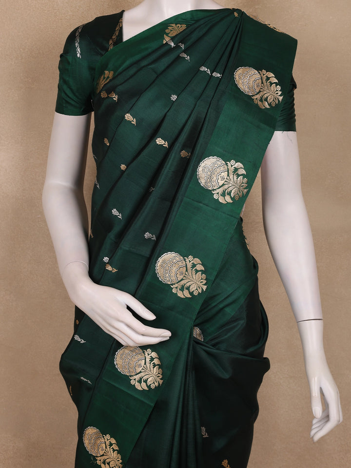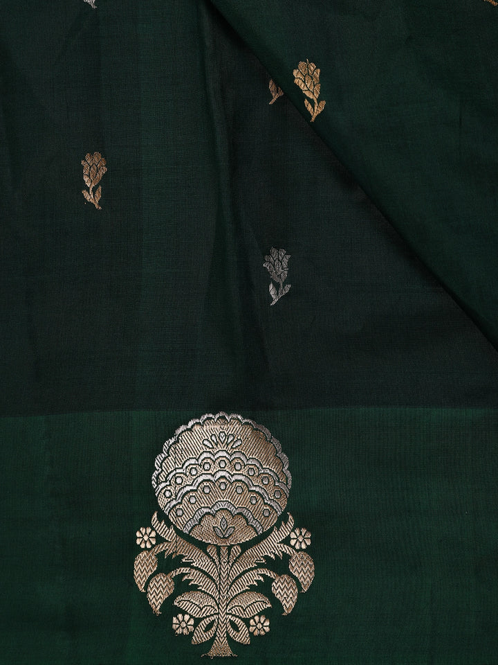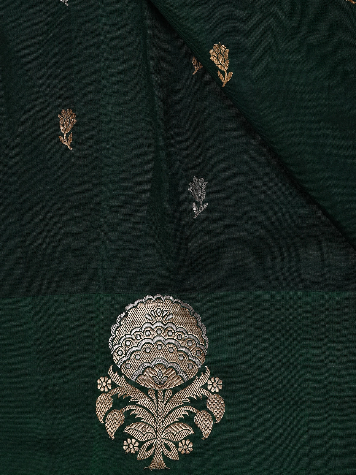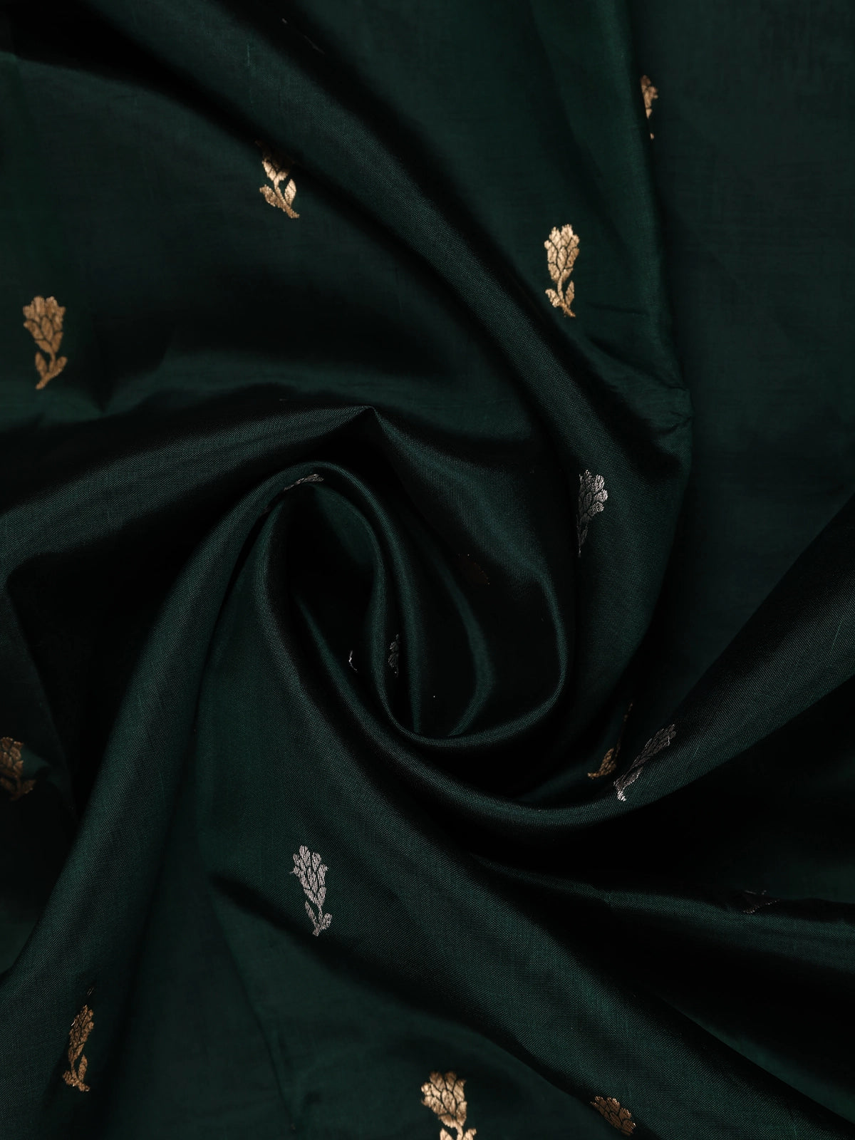 Drape yourself in the royal charm of Banaras with this Bottle Green Butta Woven Katan Banarasi Saree, a perfect fusion of elegance and tradition. Woven meticulously from pure Katan silk, this saree features intricate zari buttas scattered gracefully across its lustrous body — a symbol of timeless craftsmanship.