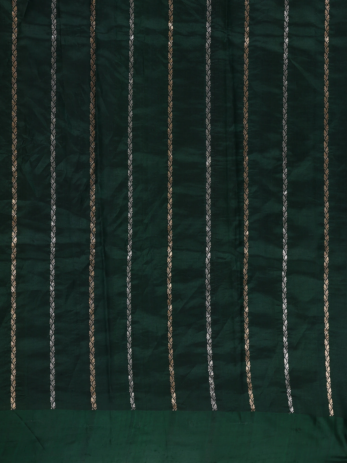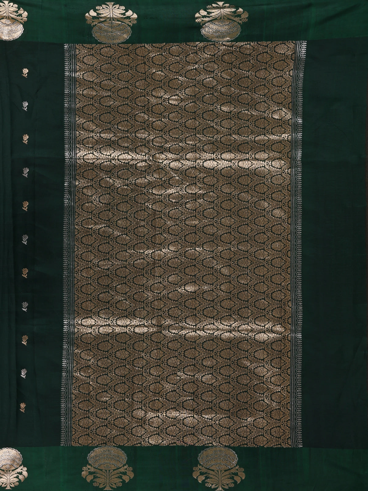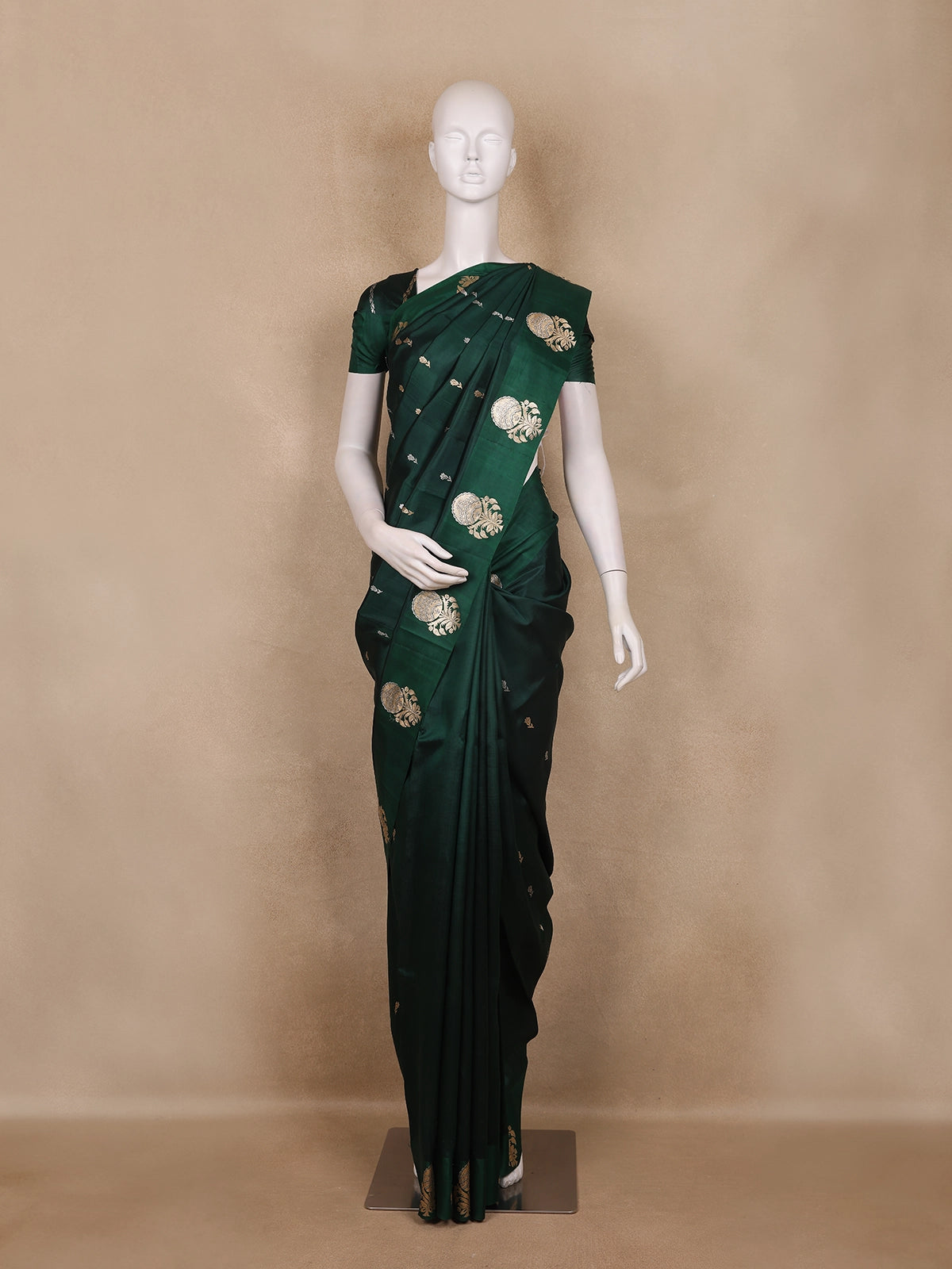 Drape yourself in the royal charm of Banaras with this Bottle Green Butta Woven Katan Banarasi Saree, a perfect fusion of elegance and tradition. Woven meticulously from pure Katan silk, this saree features intricate zari buttas scattered gracefully across its lustrous body — a symbol of timeless craftsmanship.