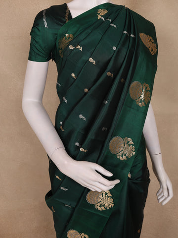 The matching green blouse and pallu complement the saree’s deep hue, while the zari border adds a rich, festive glow. Its silky texture offers a graceful fall, ensuring comfort and sophistication for long celebrations or traditional occasions.