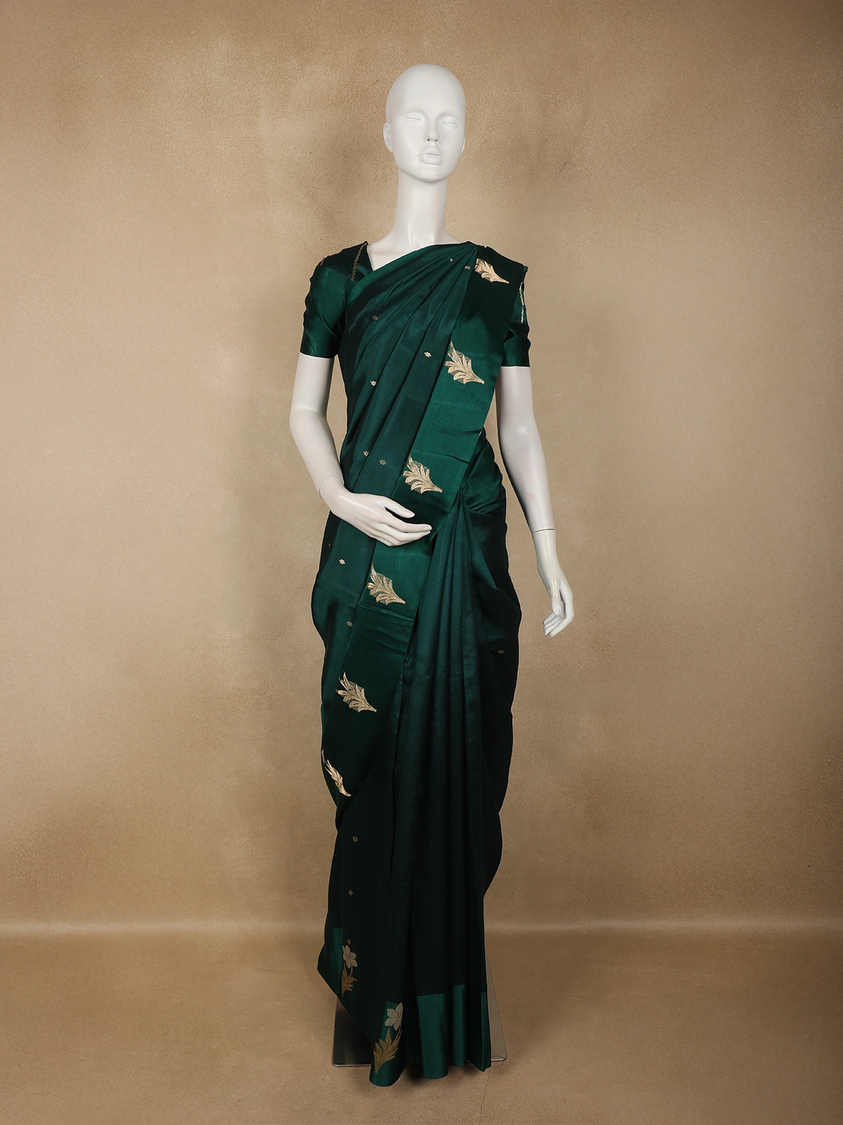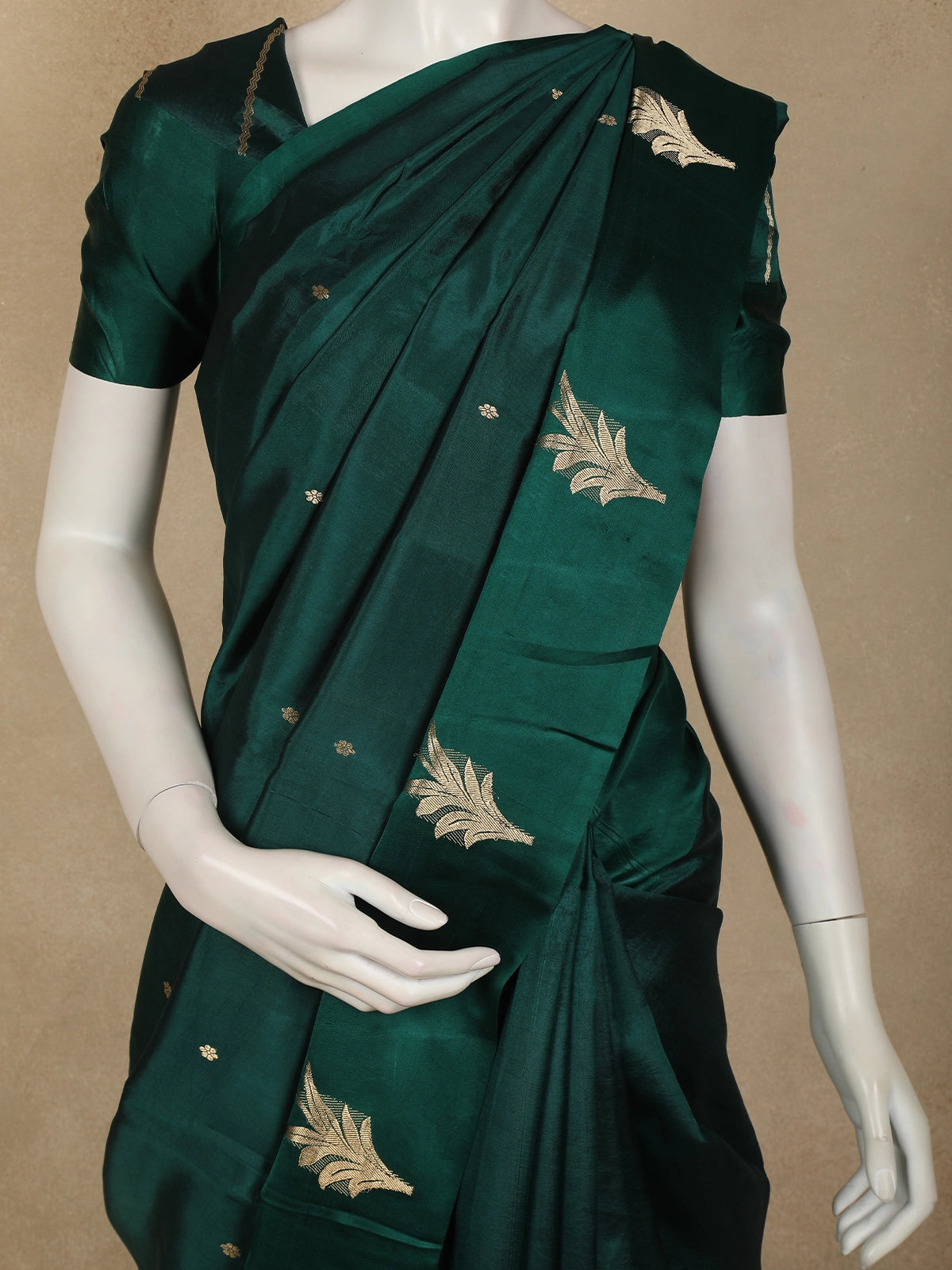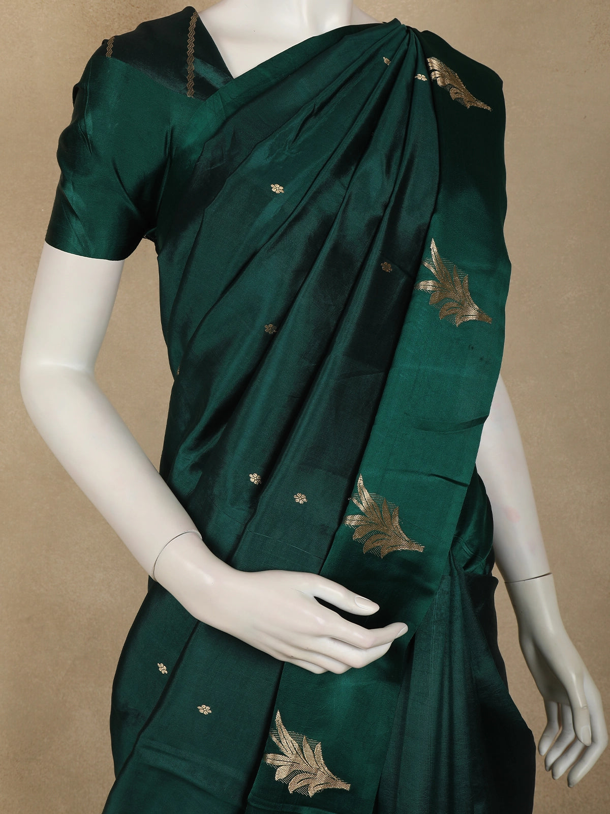Exude timeless elegance with this Bottle Green Pure Banarasi Silk Saree, a classic drape that beautifully blends heritage craftsmanship with refined luxury. Crafted in authentic Banarasi silk, this saree showcases a rich bottle green hue that radiates depth, grace, and regal charm—making it a perfect choice for grand occasions.