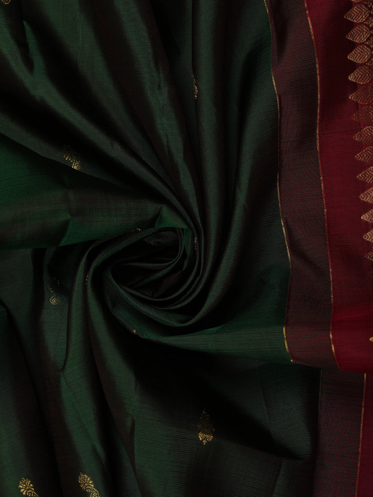Exude timeless grandeur with this Bottle Green Pure Kanchipuram Silk Saree, a classic masterpiece that celebrates South Indian weaving heritage. The deep bottle green base lends a regal depth and traditional charm, making it a perfect choice for weddings, temple ceremonies, and festive occasions.