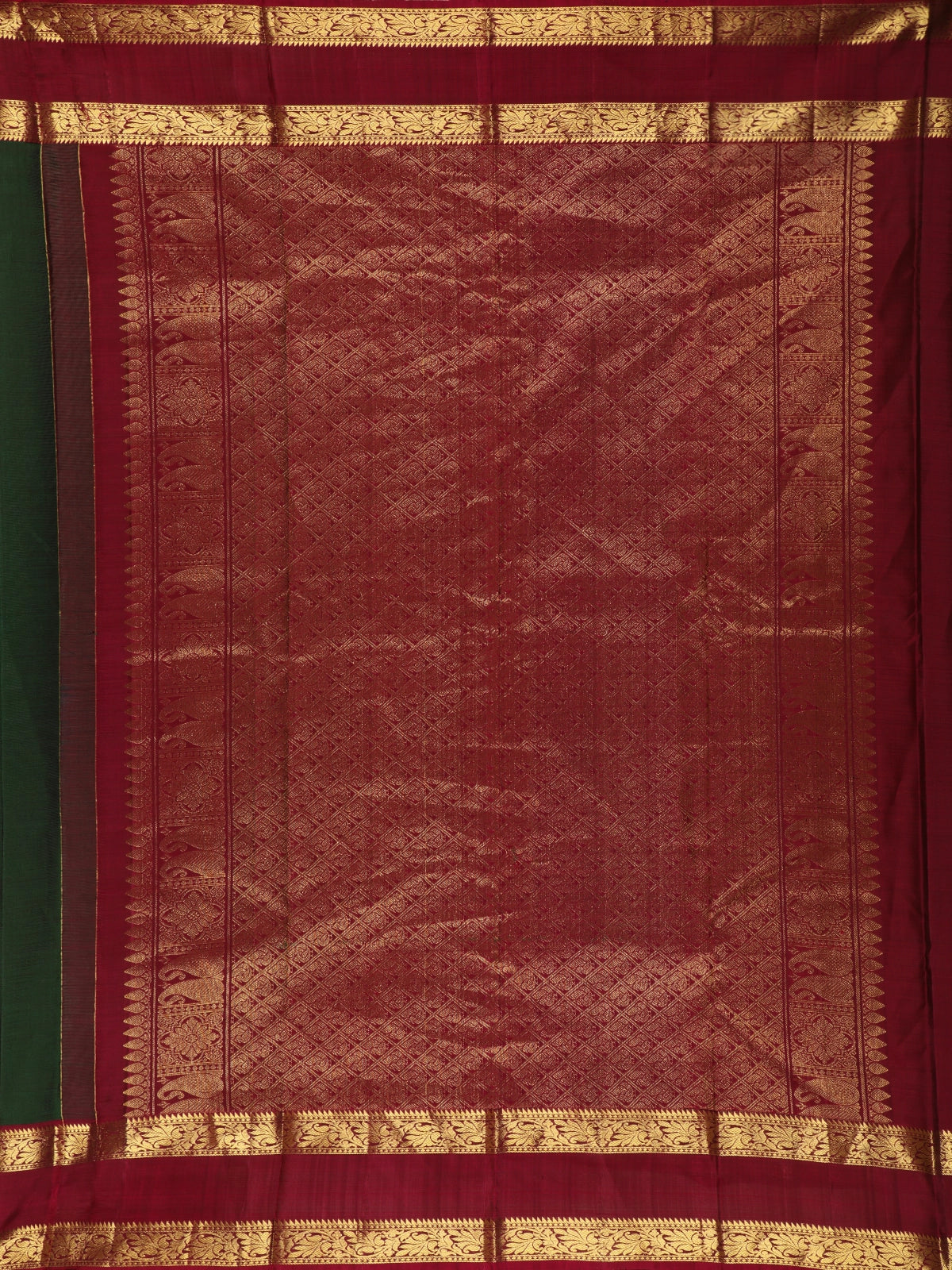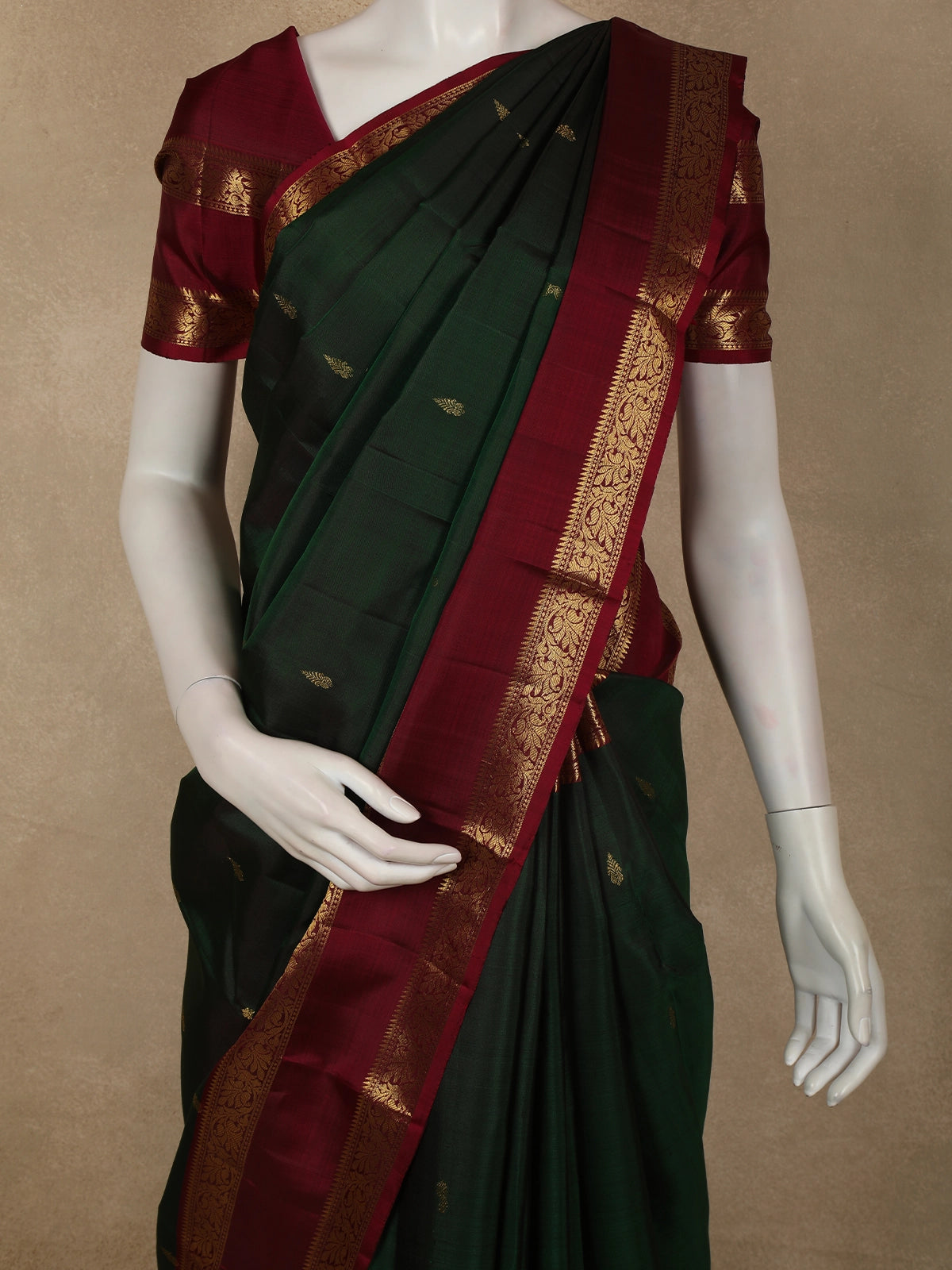 A striking contrast zari border in rich maroon with antique gold detailing frames the saree gracefully, adding a bold traditional finish. Paired with a matching maroon blouse featuring gold accents, the ensemble achieves a harmonious balance of colour and craftsmanship.