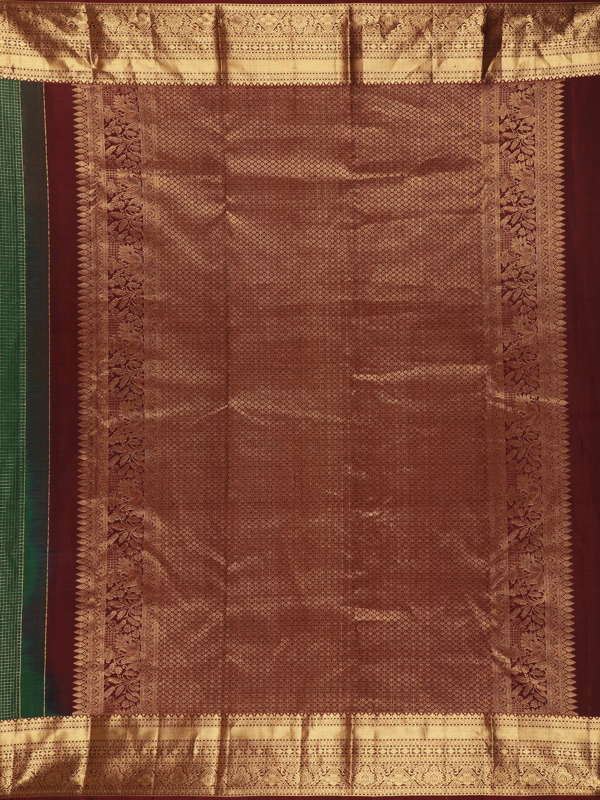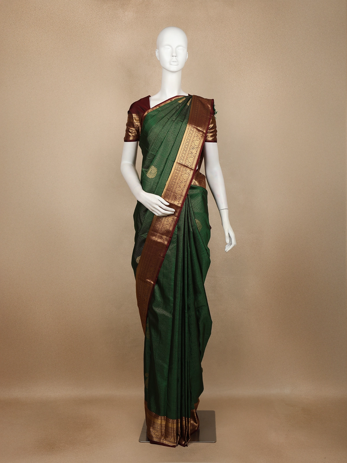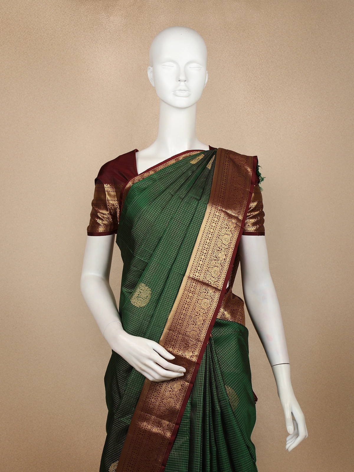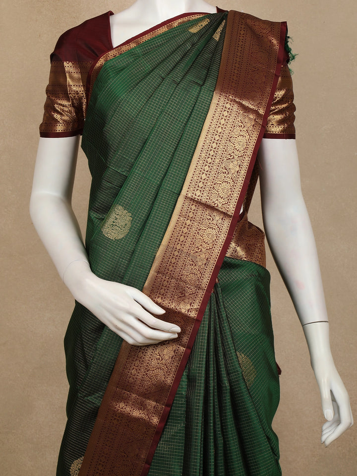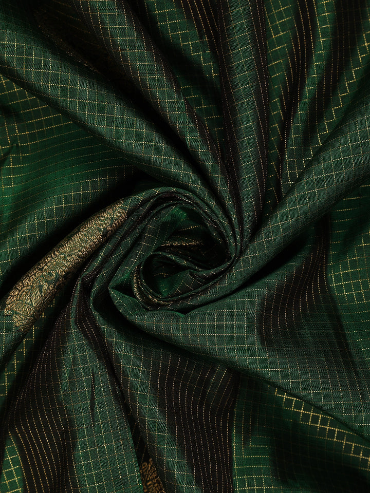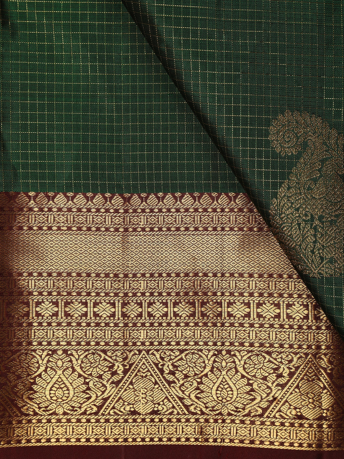 Bottle Green Checked Woven Pure Kanchipuram Silk Saree with Contrast Zari Border