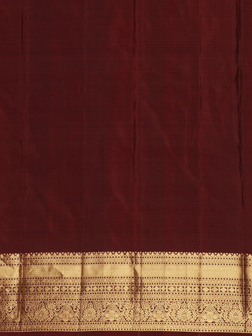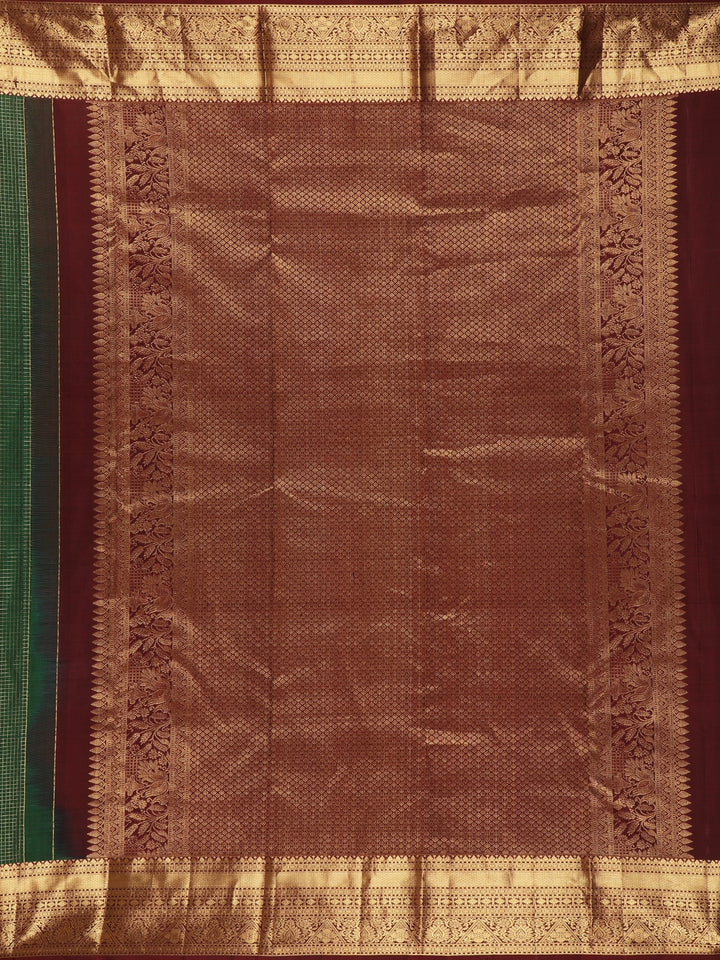 Step into timeless elegance with this exquisite Bottle Green Pure Kanchipuram Silk Saree featuring a refined micro-checked pattern throughout the body. The luxurious handwoven silk is elevated with intricate golden zari motifs that add a royal charm to the drape. The contrasting maroon zari-woven border and pallu reflect traditional artistry with delicate floral and temple-inspired patterns, creating a striking visual appeal.